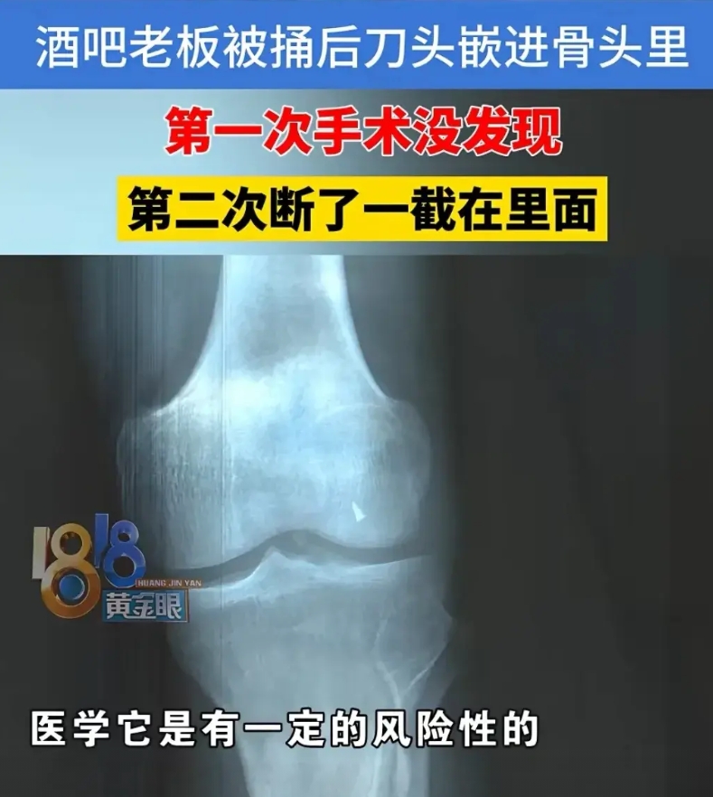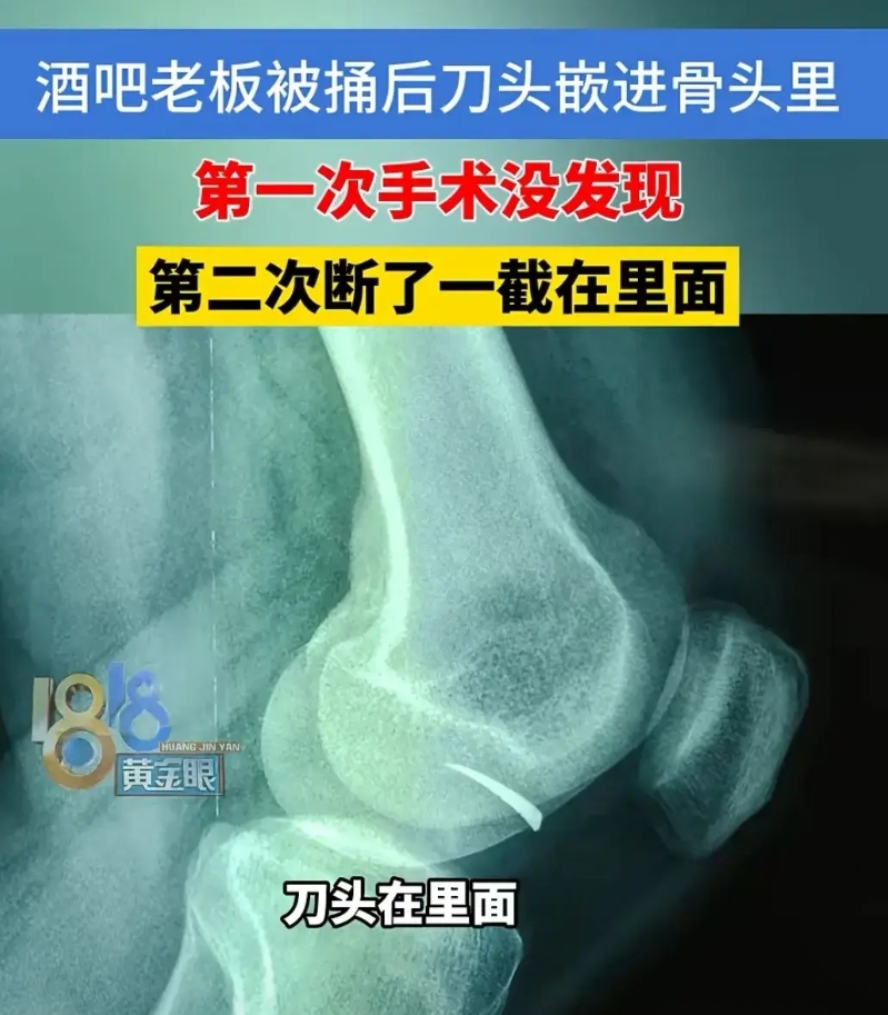 而医生跟他说这个刀的质量实在太好了,现在要取出那刀尖就得敲碎骨头,否则取不出来。