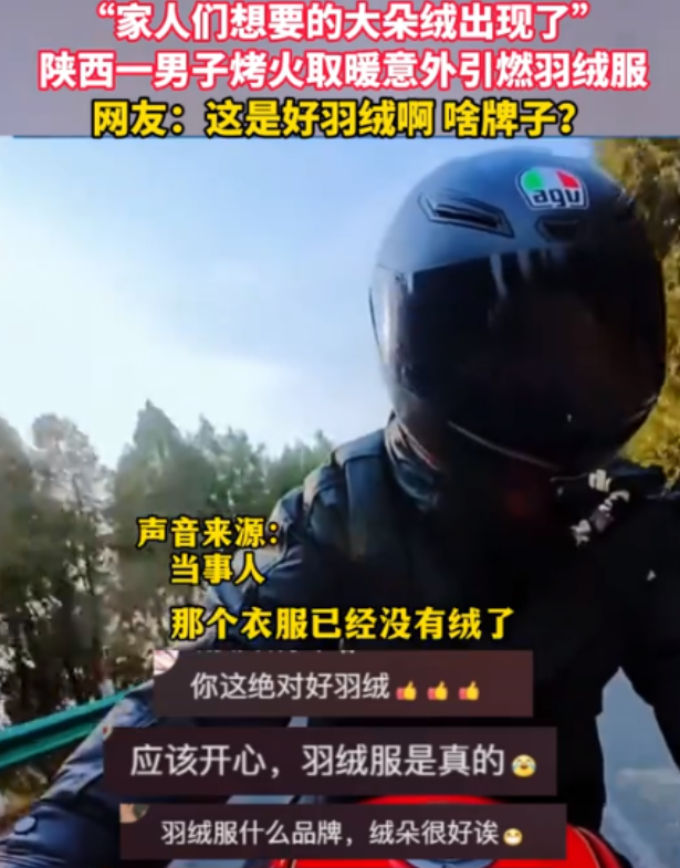这一天白跑了!陕西咸阳,一名男子骑车去跑山,半路的时候,他看见果园里有个火堆,于是,他就站在旁边烤火,结果,下一秒就凌乱了。男子带着头盔,他突然发现身体开始冒烟看,低头一看,好家伙,羽绒服燃了。 此时此刻,他连忙灭火,可惜羽绒服面料已经烧了一些洞了。随后,男子继续骑车回家,结果一路上只见那羽毛在风中凌乱,回到家时,肚子那一截的羽绒服已经没绒了。 这么说,这件羽绒服的功劳还不小,既替他挡风遮寒,还替他挡火隔热,完美地奉献了羽绒服的一生,最后还灰飞烟灭了,真是让人哭笑不得。男子说羽绒服大概买成480多元,确实,这一天差不多白跑了! 以前,网上的视频总是拍摄宠物被烧毛无知觉的现象,但没想到,人也会遇到这种情况,奇葩的是:衣服燃起来了都不知道? 这可能就是男子带了头盔的原因,头盔比较厚实,可能会挡一部分正下方的视线。其实,下车了,就可以把头盔摘了。再者,这件事也反映出烤火的弊端,遇到这种大火堆,火苗很容易飞溅,再加上山上有风,不知不觉就飞到身上了。 可以看到,男子实际上距火堆还有近2米的距离,如果不是火苗飞过来,估计周围的温度还没有达到衣服的燃点。但一点点火苗就可以引燃衣服,说明星星之火可以燎原,烤火的安全性一定不要忽视。