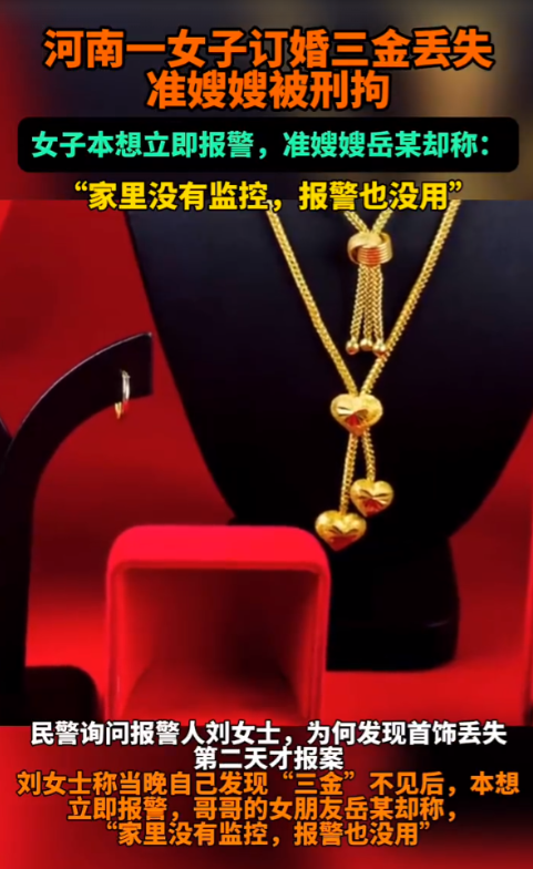 河南南阳,一女子下班回家时发现,自己刚收的订婚三金不见了,询问母亲,母亲说这些天家里没来陌生人。寻找无果后,女子打算报警,然而自己的“准嫂嫂”却说“家里没有监控,报警也没用”。警方调查后发现,偷走三金的正是这个“准嫂嫂”!