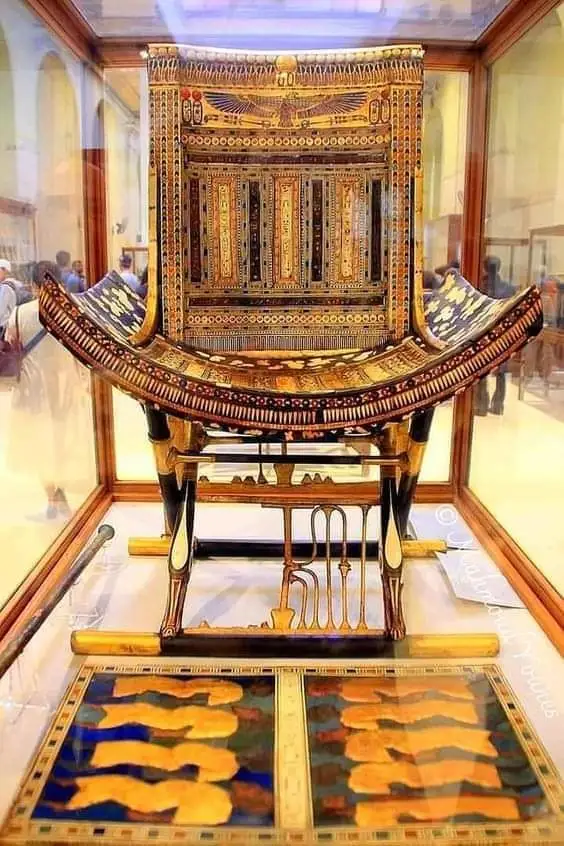 图坦卡蒙的王座高高的弧形椅背安装在一张凳子上,凳子交叉的腿上雕刻着鸭子的脖子和头。深弧形的座位(设计用来放置坐垫)上镶嵌着乌木和象牙,模仿有斑点的动物皮。