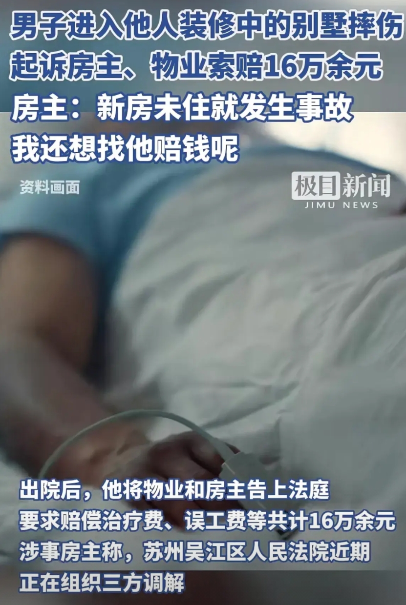 江苏苏州,男子在亲友家小区里闲逛,看见一栋正在装修中的别墅没上锁,便心生好奇,推门走了进去。进去后,男子四处张望,结果一个不注意竟踩空了,直接从房间施工处摔到了负一楼地下室。男子多处摔伤,住院治疗花了12万,光住院费就高达9万,他不甘心认栽,就把物业和房主全部告上法庭,要求赔偿他16万。房主却说,我新房子还没住就见了血,我还想让你赔钱呢!
