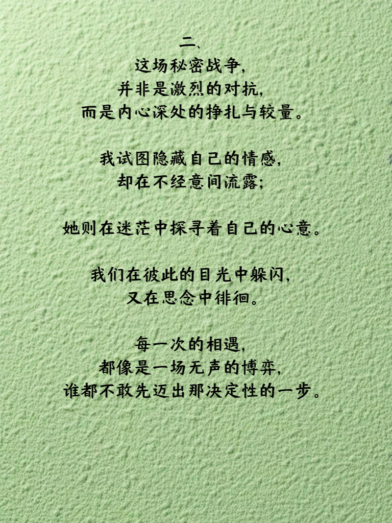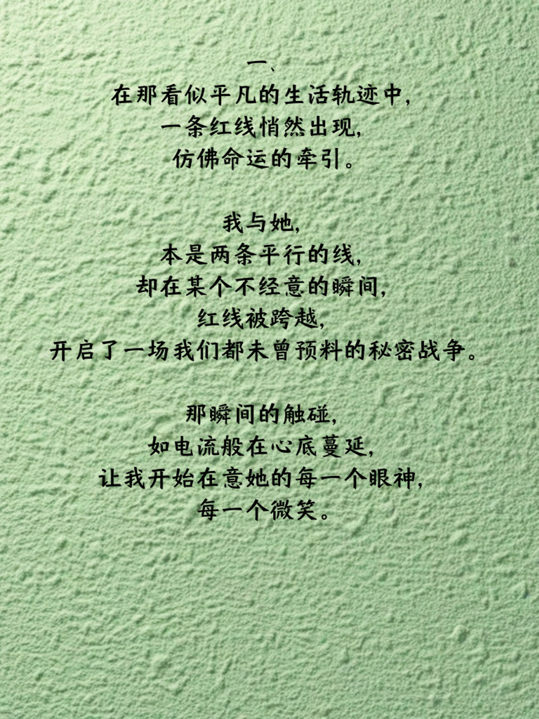 一、在那看似平凡的生活轨迹中,一条红线悄然出现,仿佛命运的牵引。我与她,本是两条平行的线,却在某个不经意的瞬间,红线被跨越,开启了一场我们都未曾预料的秘密战争。那瞬间的触碰,如电流般在心底蔓延,让我开始在意她的每一个眼神,每一个微笑。 二、这场秘密战争,并非是激烈的对抗,而是内心深处的挣扎与较量。我试图隐藏自己的情感,却在不经意间流露;她则在迷茫中探寻着自己的心意。我们在彼此的目光中躲闪,又在思念中徘徊。每一次的相遇,都像是一场无声的博弈,谁都不敢先迈出那决定性的一步。 三、然而,红线的跨越终究无法被忽视,它如同心中的火焰,越烧越旺。我开始反思自己的内心,为何会对她如此在意?她的一颦一笑,为何能牵动我的心弦?这场秘密战争,或许是我们成长的契机,让我们学会面对自己的情感,勇敢地去追求属于自己的幸福。