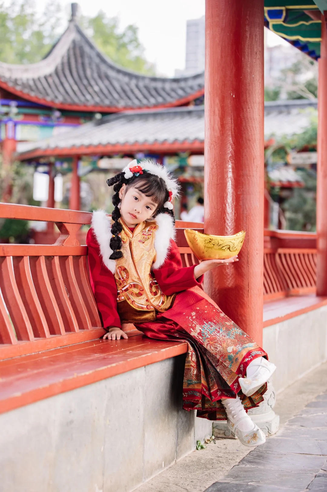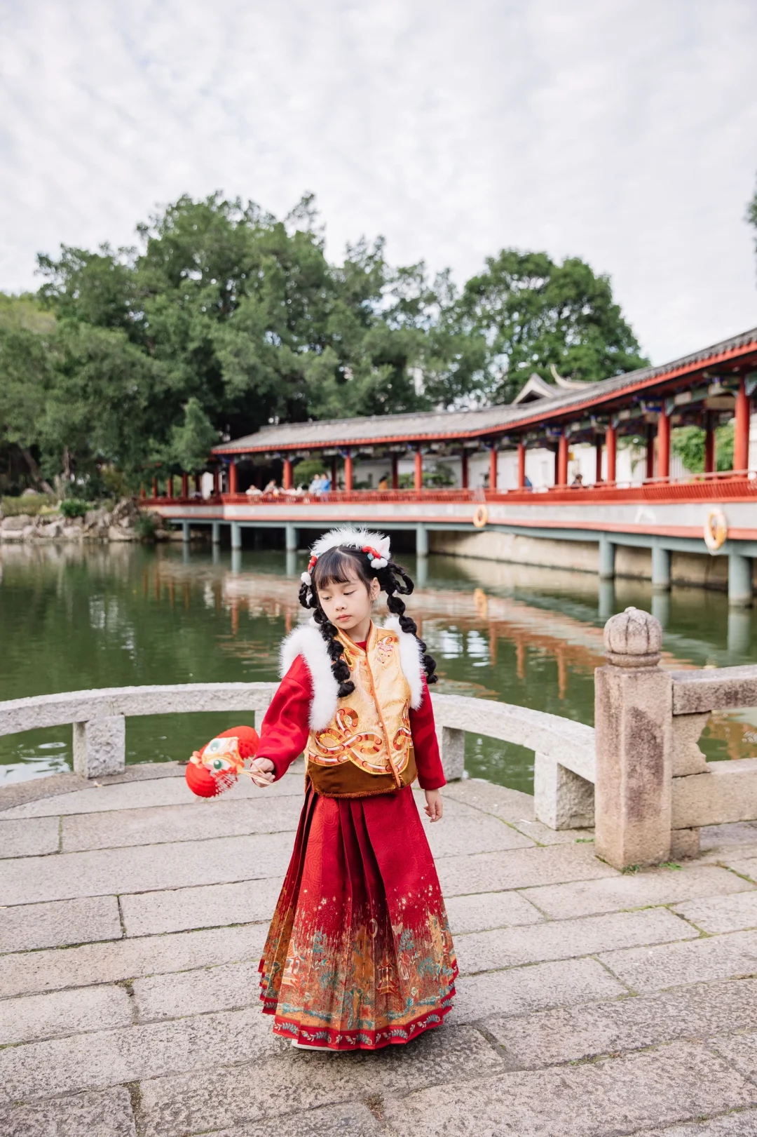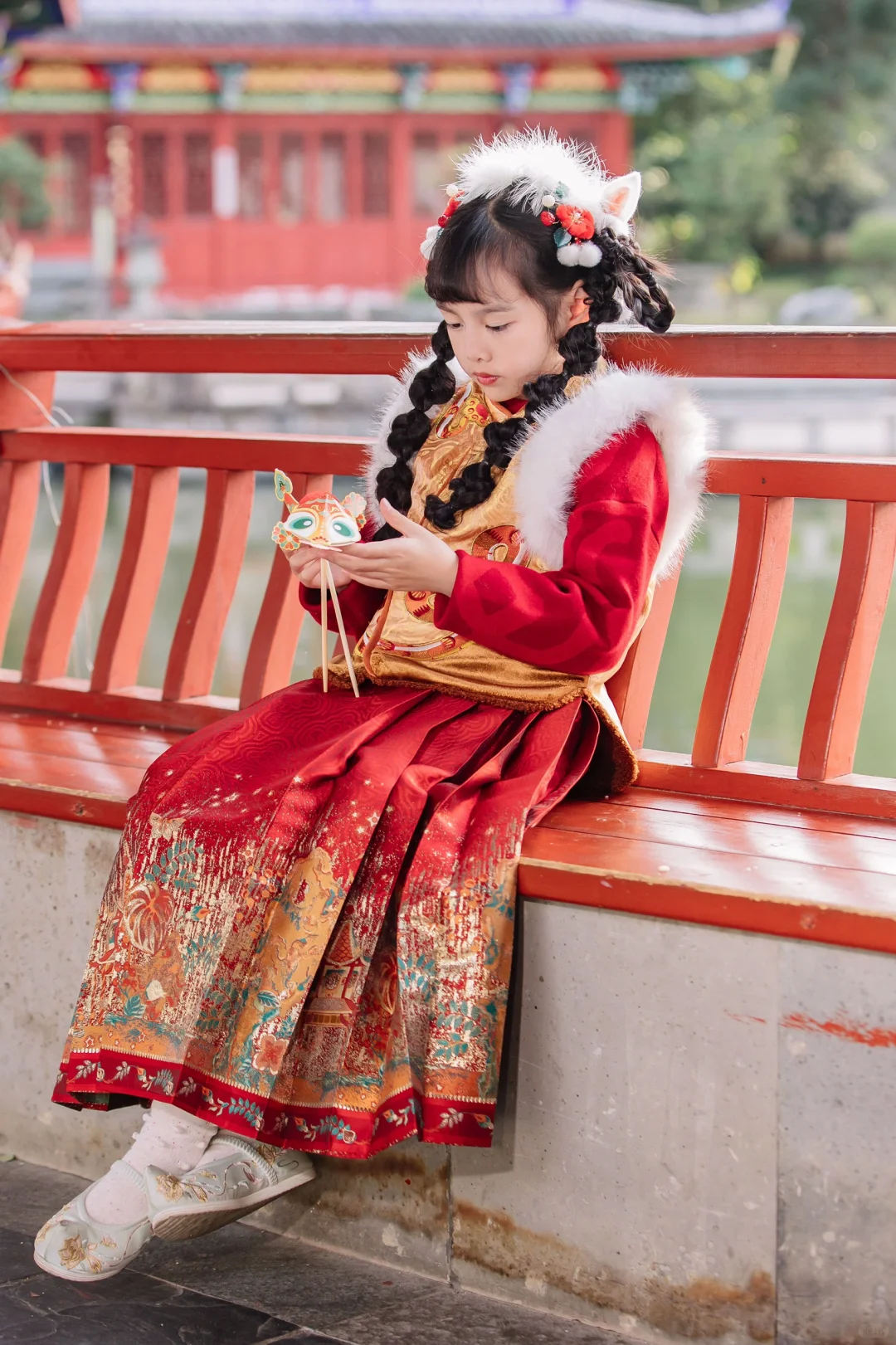 [鞭炮R][鞭炮R]下身搭配的事马面裙:烫金马面裙,真的超显贵,小千金风拉满咯!!裙摆对称不说而且褶裥均匀~穿在宝妹身上显的端庄又大气呢~~春节穿这套,实在是太有气质啦!