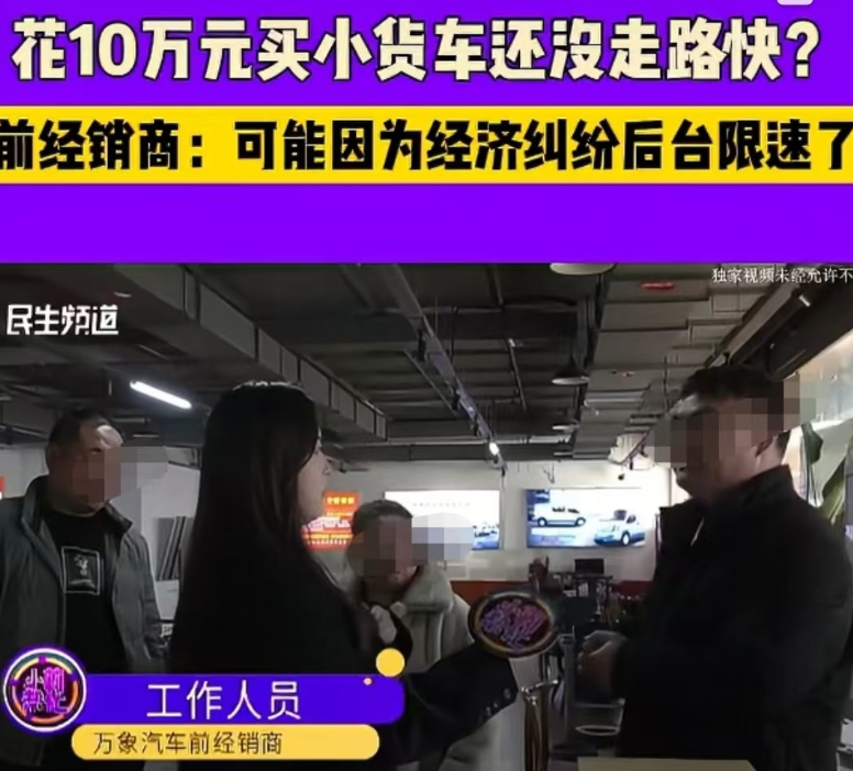 河南,郑州。夫妻俩花10万元买了一辆小货车,开了不到一年车子突然走不动了,最快只能跑6码,妻子气笑了:油门加到底都没我走路快!车商无奈地表示:我们也解决不了,可能是因为经济纠纷后台限速了。