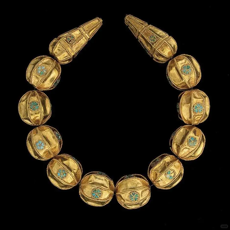 金项链(公元 1 世纪),出土于阿富汗希比尔甘附近朱兹詹省考古遗址 Tillya Tepe(金丘)的一座古墓中。