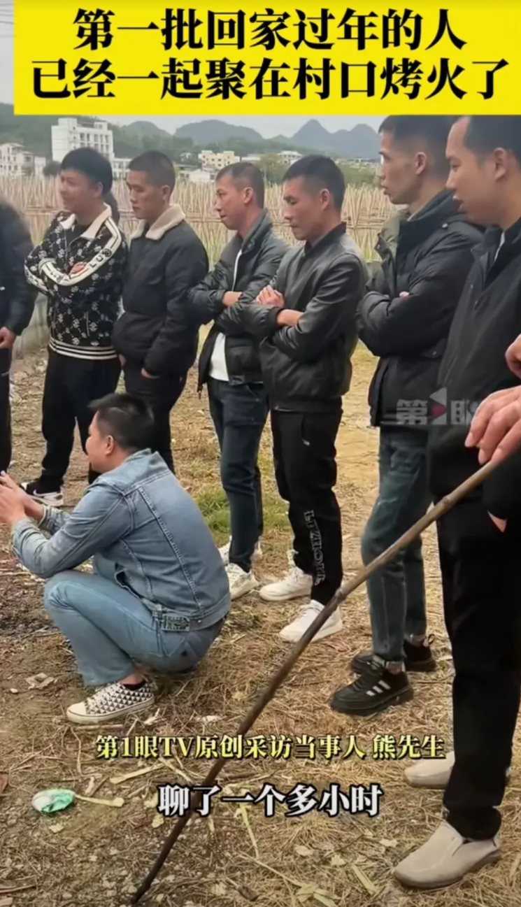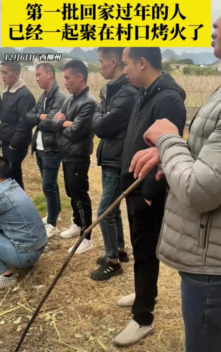 太搞笑了!广西柳州,第一批回家过年的人,已经聚在村口烤火了,但有一个搞笑的现象:一群小伙围在火炉旁聊了一个多小时,就是没有人发烟,光站着聊天。