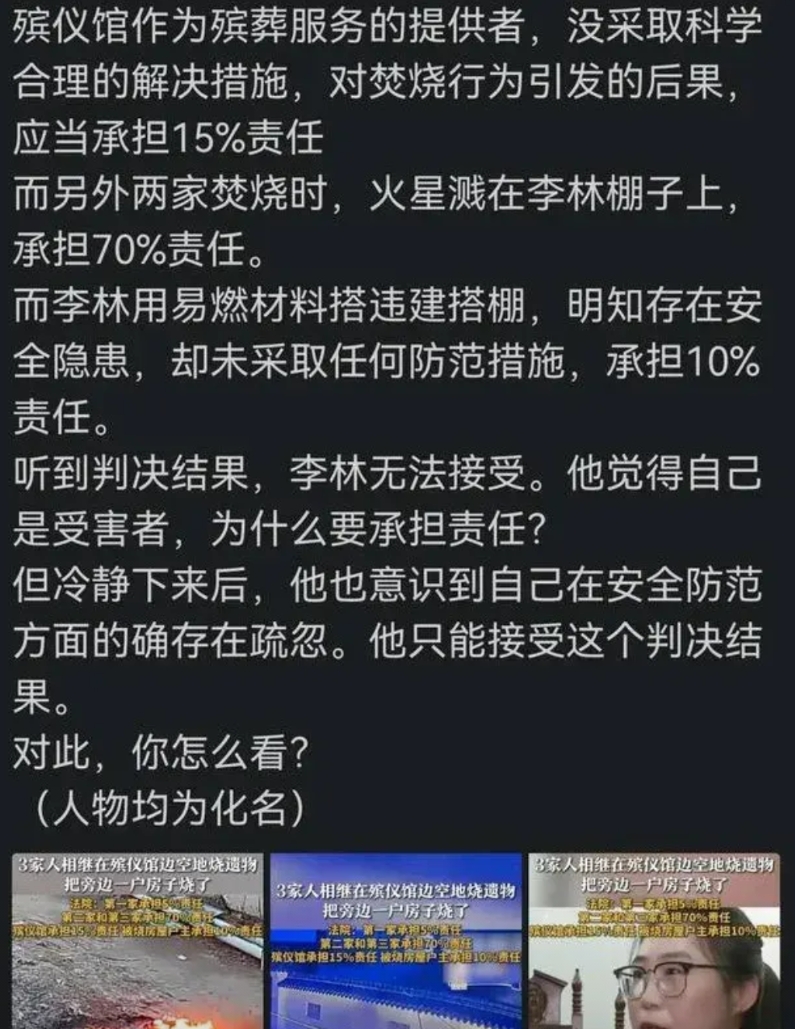 房屋被人误烧,房主担责10%的责任。 我其实很不理解,为什么受害人还有责任,直到看了法官的理由,我才恍然大悟,有学识的人考虑的就是不一样,她要考虑所有的原因,然后开始和稀泥! 其他的不说,我们只说房主担责的理由,用易燃材料违建搭棚,存在安全隐患,却未采取任何措施,所以承担10%责任!从这里看合情合理,可我觉得违建和这次事件没有关系,法律规定用易燃材料违建,消防部门可以要求施工方整改,拆除甚至查封!这是合情合理的,但你不能因为别人违建了,就一把火给别人烧了吧,这损坏别人的财产就应该赔偿。至于房主用易燃材料违建搭棚,这是消防部门需要处理的问题吧!安全隐患不都是相关部门重点排查的事情吗?这属于整改不到位!不知道需不需要追责! 反正我觉得这是两件事,应该分开处理,烧房子是一件事,违建是另外一件事!这幸好房子里没人,如果有人就是另外的故事了!