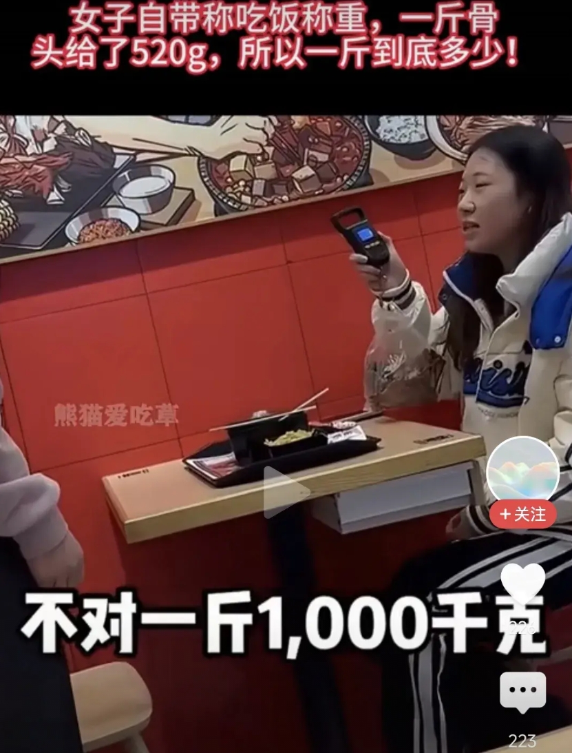 你说她傻吧,还知道拿个称,但是谁去饭店吃饭拿称呢,打假的?也不认称啊