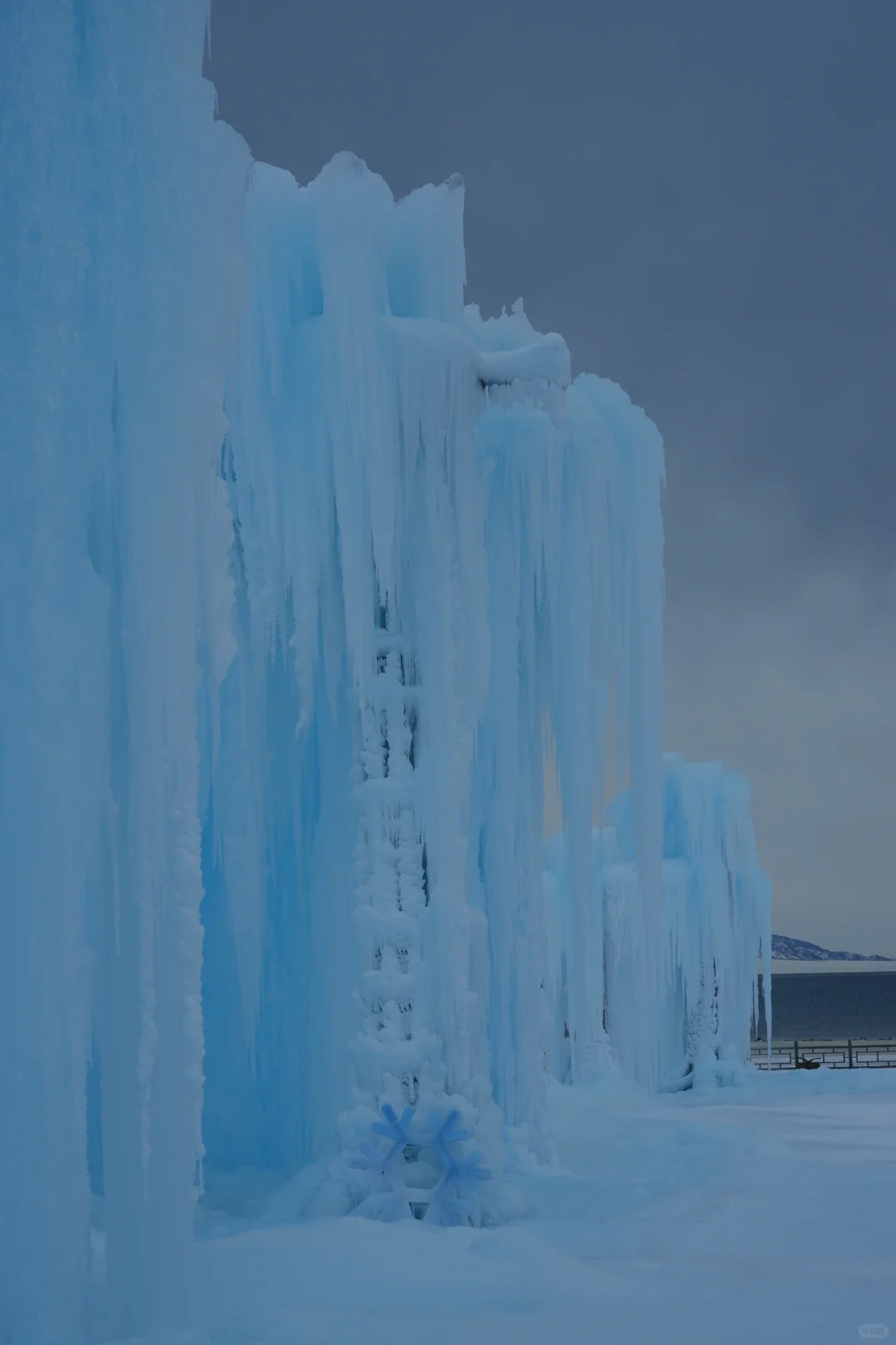 蓝冰雕塑屹立在湖面左侧