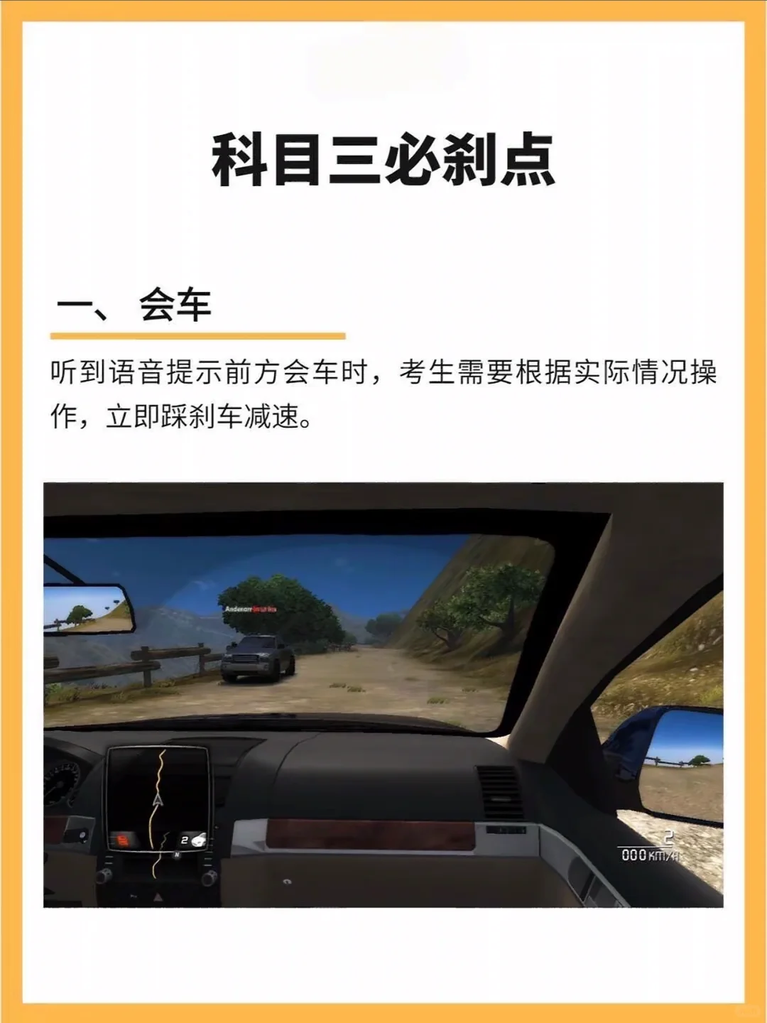 科目三必刹点 一、会车 听到语音提示前方会车时,考生需要根据实际情况操作,立即踩刹车减速。