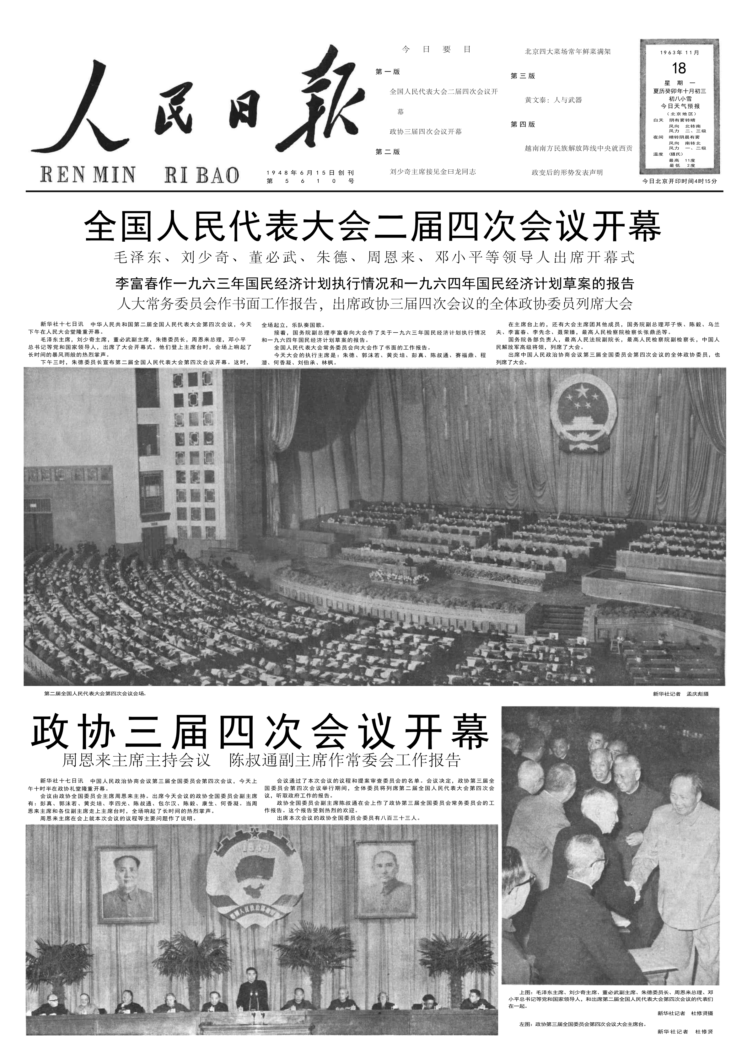 1963年11月17日,第二届全国人民代表大会第四次会议在北京举行。会议通过《关于一九六三年国民经济计划执行情况和一九六四年国民经济计划草案的报告》、《关于一九六三年国家预算草案和预算执行情况、一九六四年国家预算初步安排的报告》和《关于第三届全国人民代表大会代表名额和选举问题的说明》。大会号召全国人民为把中国建设成为一个具有现代农业、现代工业、现代国防和现代科学技术的强大的社会主义国家而奋斗,为世界和平、民族解放、人民民主和社会主义的伟大事业而 奋斗。毛泽东出席了大会的开幕会议和闭幕会议,还出席了十一 月十八日和十二月二日的全体会议