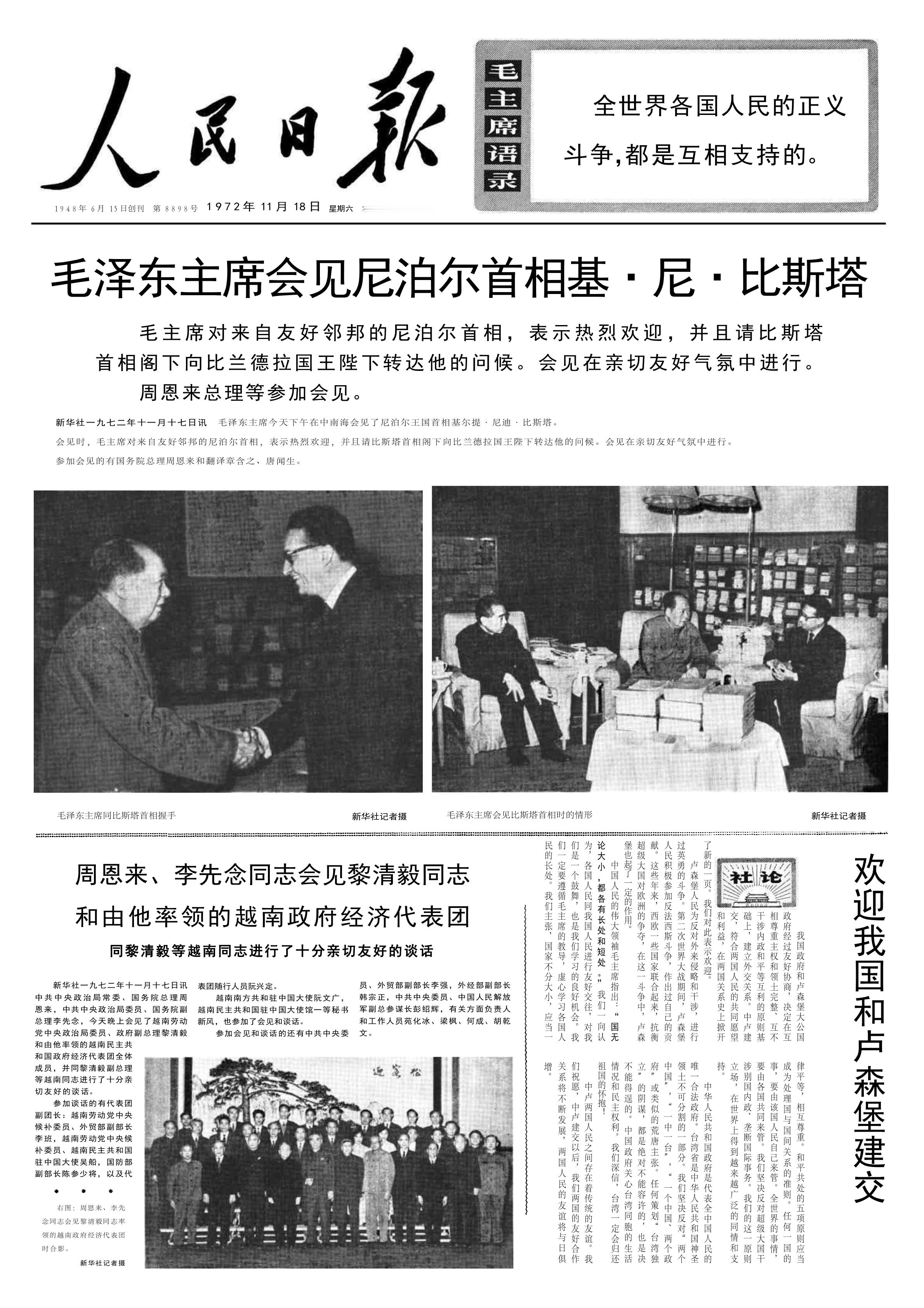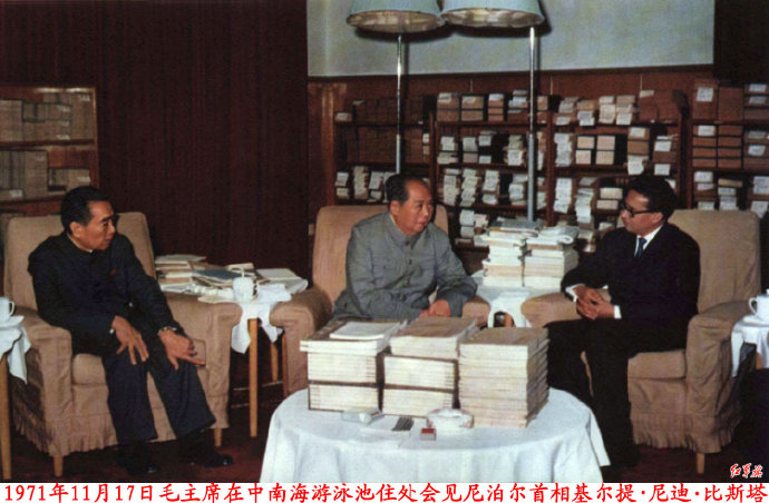 1972年11月17日晚上,毛主席在中南海游泳池住处会见尼泊尔首相比斯塔,周恩来在座。双方交谈南亚的一些政治情况。当比斯塔说这是第三次见毛泽东时,毛泽东说:没有第四次了,我要到阎王那里去搞革命了,把地狱中的制度破坏一下。