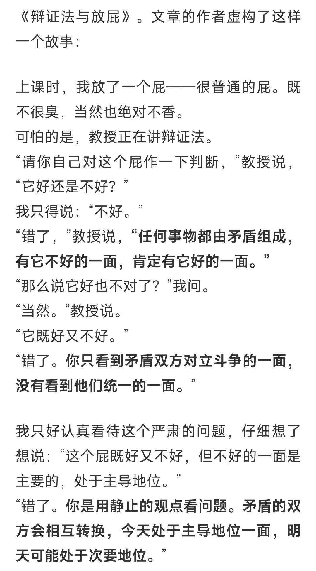 生活中常说,凡事皆有两面性。可没说凡物皆有两面性啊。屁是物,放屁才是事。放屁自然有它不好的一面,但也有它好的一面,就是有利于放屁者的身体健康,试想,屁一直憋着,对人体能好吗?再举一例,便宜是事,于是便有了便宜无好货、好货不便宜这种充满了辩证意味的俗语。