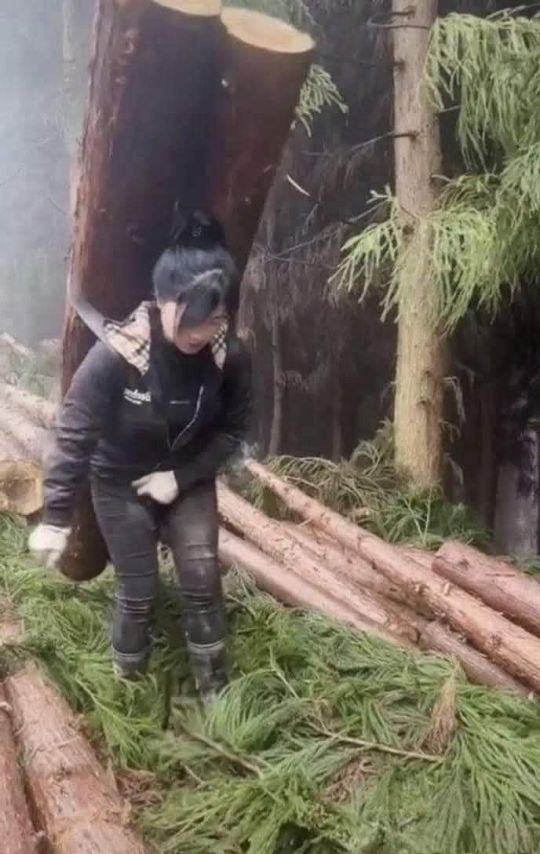 我觉得只要脑子正常都知道这是假的,两米高的湿杉木一根就有100公斤以上,她能背起两根,还没把她压死,她真是个超人!