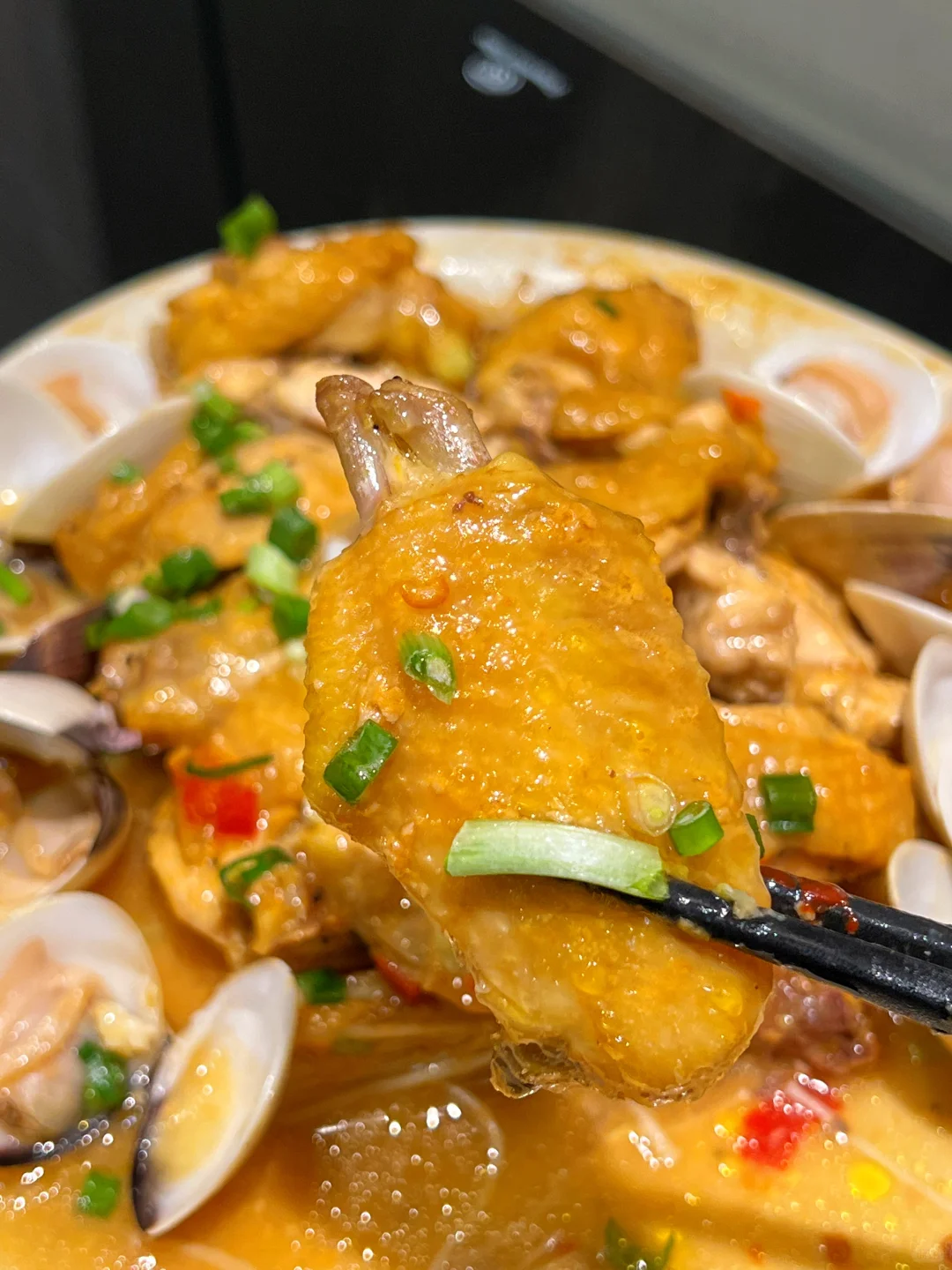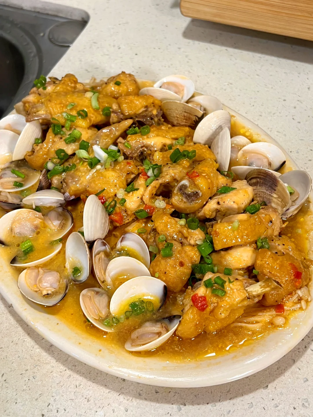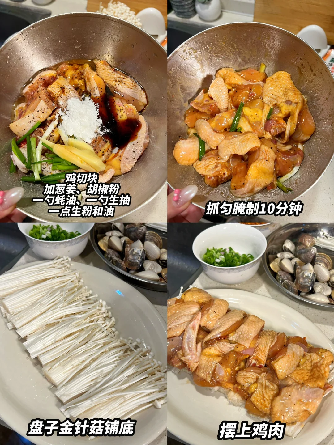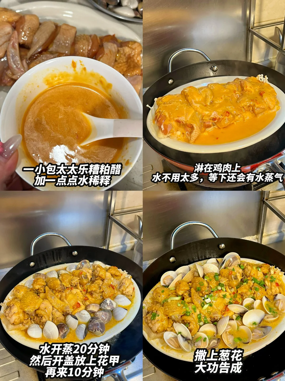 做法: 1️⃣鸡切块,加姜蒜、加一点蚝油、胡椒粉、生粉和油抓匀,简单入个底味就行 2️⃣金针菇铺底,摆上鸡肉 3️⃣太太乐糟粕醋来一小包,然后加一点水稀释,淋在鸡肉上(水不用太多等会还会有水蒸气),水开蒸30分钟就ok,撒上葱花就出锅! 海鲜和糟粕醋也很搭!!所以俺最后十分钟还加了花甲进去!哦莫!!超上头! 亲测了煮泡面粉丝也是一等一的好吃!!!!!!平时下班回家晚的可以去试试啊啊啊啊