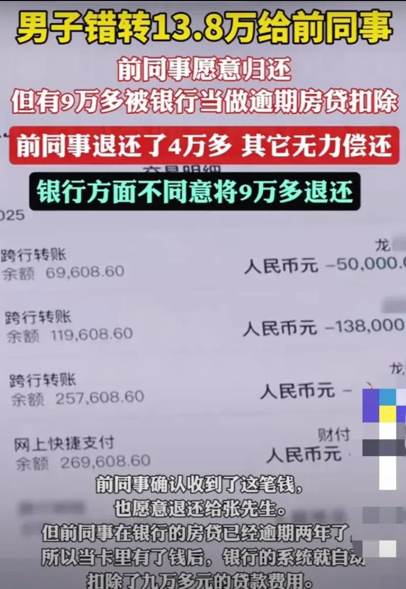 “这次不能怪银行!”贵州贵阳,男子误将13.8万元转给前同事,谁料因前同事欠银行的房贷,钱一到账前同事的账户就被银行直接划走9万多。男子向前同事讨要,前同事愿意还款,但是表示无力偿还,男子随后又向银行讨要,结果又遭到了银行的拒绝。(来源:百姓关注)