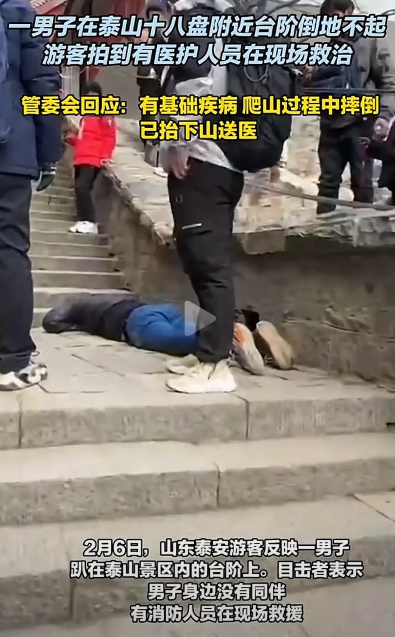 之后,泰山景区管委会工作人员作出了回应:该男子有基础病,当时感觉身体不舒服,想靠在路边休息一下,谁知突然就晕过去了。并提醒大家,登山一定要量力而行,不舒服不要硬爬,逞英雄,最好结伴而行,这样可以互相照应。