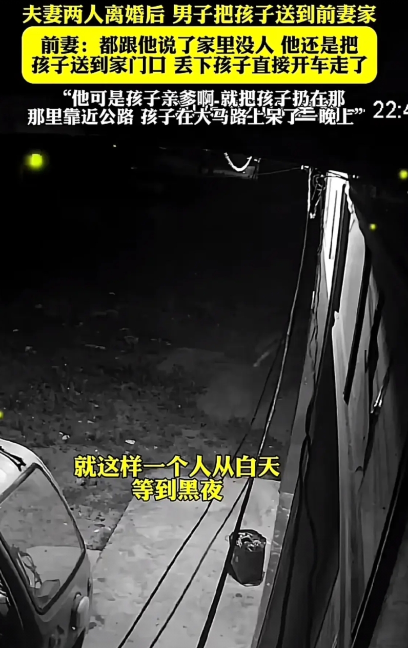 2025年2月3日,一对夫妻离婚后,男子将孩子送到前妻家。前妻称已告知对方家里没人,男子仍把孩子丢在门口后驾车离开。孩子被丢在靠近公路的大马路上,独自待了一整晚。期间前妻打电话、给男子姐姐发信息均无人回应。孩子无助地望着父亲离开的方向,引发网友对孩子遭遇的心疼和对男子行为的谴责。