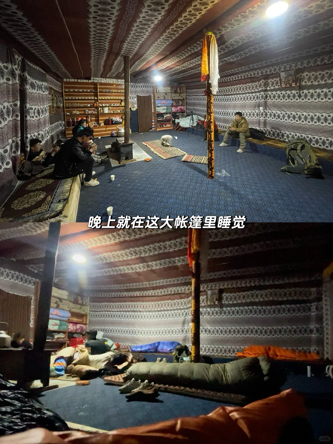 🌟夜幕降临,我们一行人都因为高反和饭后升糖变得“醉醺醺”的,各自拿出睡袋,在这牧民朋友的大帐篷里睡下了。丛山的轮廓在月光下清晰可见,星空亮得不真实,一切都安静又美好。