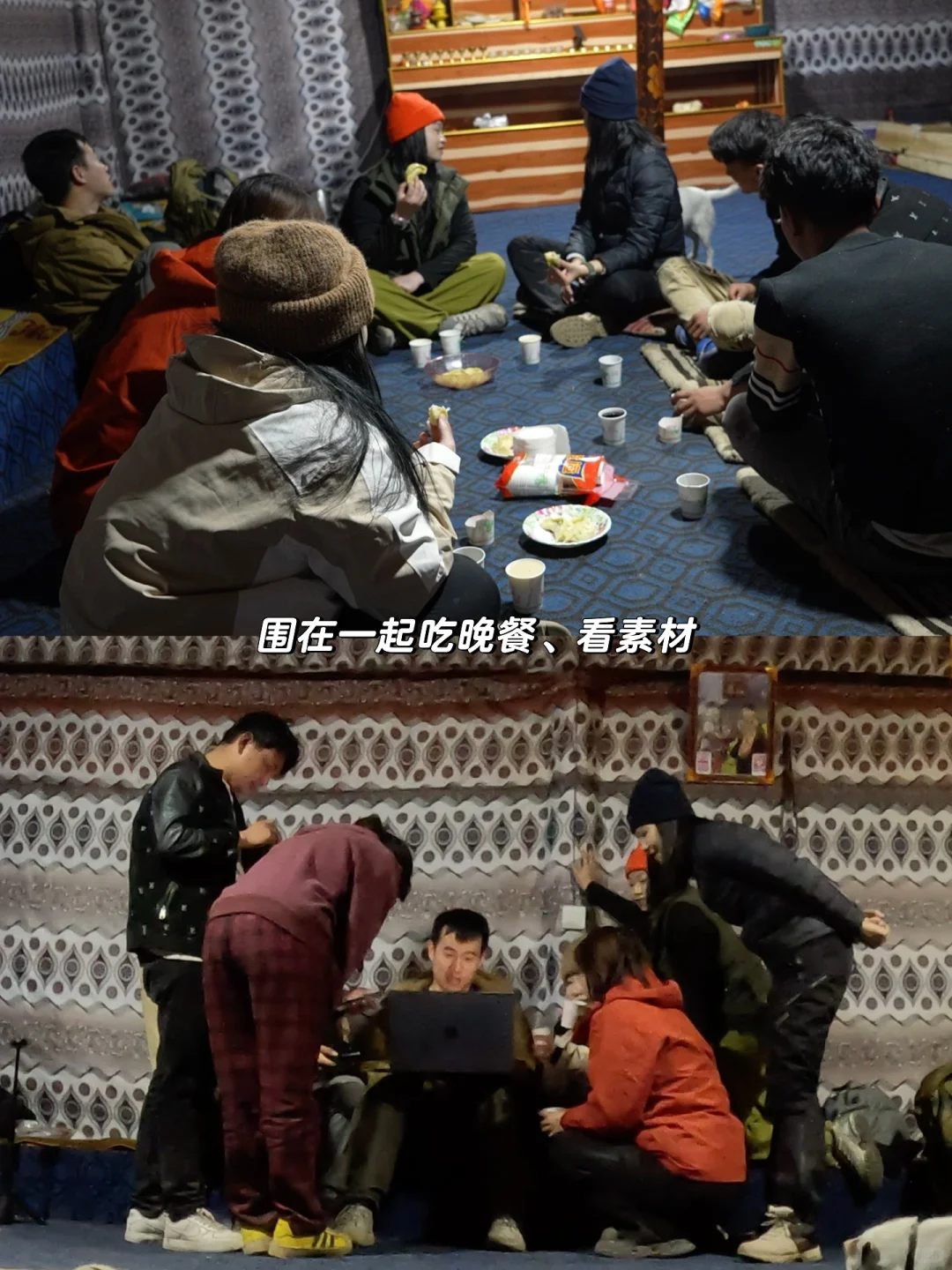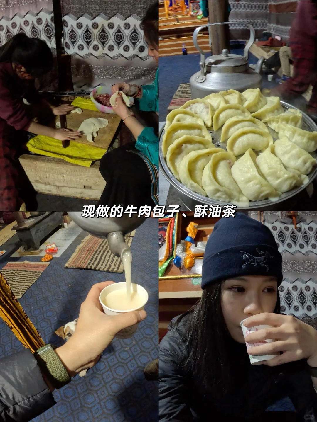 ⛺️屋子里烧着柴火,温暖得像另一个世界。弟弟给我们煮了新鲜的酥油茶,姐姐和妹妹做了热腾腾的牛肉包子,大家围坐在一起,交换着相互生活的美好——他们翻着手机相册,分享每年如何赶牛迁徙,过年是如何跳舞庆祝;而我们白天拍的雪山湖川,也受到了他们的围观和赞叹。