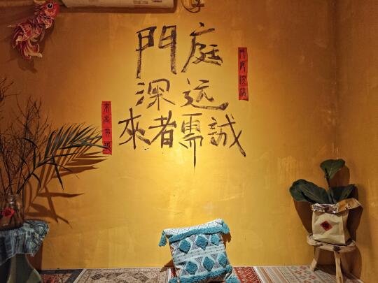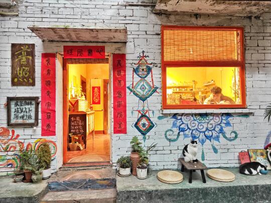 这家店也是正一道士开的店,卖咖啡为主。有很多流浪猫在这里安家,所以猫多。店不大,只有三间屋,装修风格加上了很多道教元素,比如贴了各种符。老板说可以求签算卦,也会年轻人喜欢的西方塔罗牌。我去的时候是下午五点,店里有四五个客人,这和周围大部分门可罗雀的店比起来,已经很不错了。