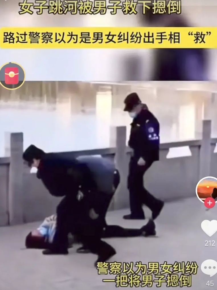 一女子想跳河轻生,一大哥好心相救,结果警察就以为发生了男女纠纷,过来就把大哥给他摁倒在地。结果大哥刚被制服的瞬间,女子就准备跳河轻生,还好警察动作比较迅速给她拉了回来。
