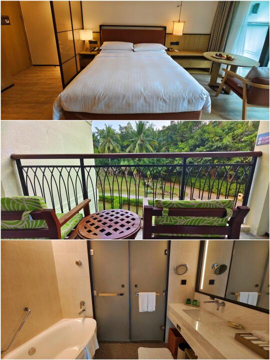 春节期间,用21000积分订的景观大床房,当天客满(当天最低房价也要现金2K多),应该是一级也没升,而且还是个角落里的02房,连个海景大床也没要到。房间46平米,有阳台( P5~P7)。
