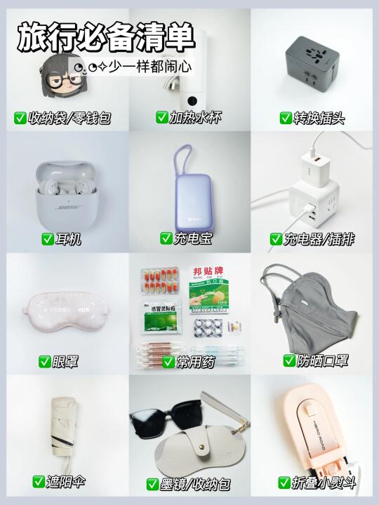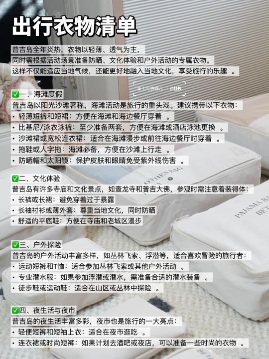 [一R]证件文件 • 护照:有效期需6个月以上 • 签证:免签,免费停留30天 • 返程机票行程单、酒店预订确认单:打印纸质版 • 租车需要国际驾照翻译本、出国旅行记得买份保险 • 防盗刷护照包:将护照、银行卡、机票、票据等贵重物品随身携带,一定要轻便防水!出行必备‼️ [二R]财务准备 • 银联卡和国际信用卡:VISA或Master卡 • 泰铢:提前兑换,在机场、小店或打车使用 [三R]电子设备 • 手机:记录旅行、导航、联系必备。 • 相机或GoPro(可选):记录高清照片或视频 • 耳机:长途旅行必备,方便听音乐或休息 • 内存卡、读卡器:用于备份照片和视频。 • 目的地电话卡/流量卡:提前在国内买泰国电话卡 [四R]充电设备 • 转换插头:泰国电压220V,需准备转换插头 • 插排:方便同时为多个设备充电 • 充电线:手机、相机、耳机等设备的充电线 • 充电宝:国外充电设施有限,充电宝是必备 [五R] 个人护理 • 衣物:夏季衣物为主,详见图⑦,薄外套(防晒或空调环境)长裤(参观寺院或正式场合)防晒帽、墨镜 • 泳衣泳裤泳镜:至少两套,适合海滩或泳池 • 鞋子:拖鞋、运动鞋、溯溪鞋 • 洗漱用品:牙刷、牙膏、毛巾(酒店可能不提供) • 一次性用品:内库、洗脸巾、湿巾、马桶垫 • 护肤美妆:日常护肤品、化妆品,重点是防晒霜↓ • 防晒霜:墙裂安利香蕉船防晒,SPF100防晒值,防水型不用一直补擦,适合跳岛游和潜水使用,海岛必备‼️芦荟胶,防晒霜的补充,晒伤后可缓解疼痛 [六R]常用药品 • 感猫药:可能因温差或疲劳免疫力低 • 肠胃药:水土不服或饮食不适 • 晕船药:参加海上活动或长途车 • 防蚊液:普吉岛潮湿,蚊虫较多 [七R]实用APP • 翻译:谷歌翻译 • 汇率:iMoney • 地图:Google Map • 酒店:Booking、Agoda • 美食:Tripadvisor • 打车:Bolt、Grab