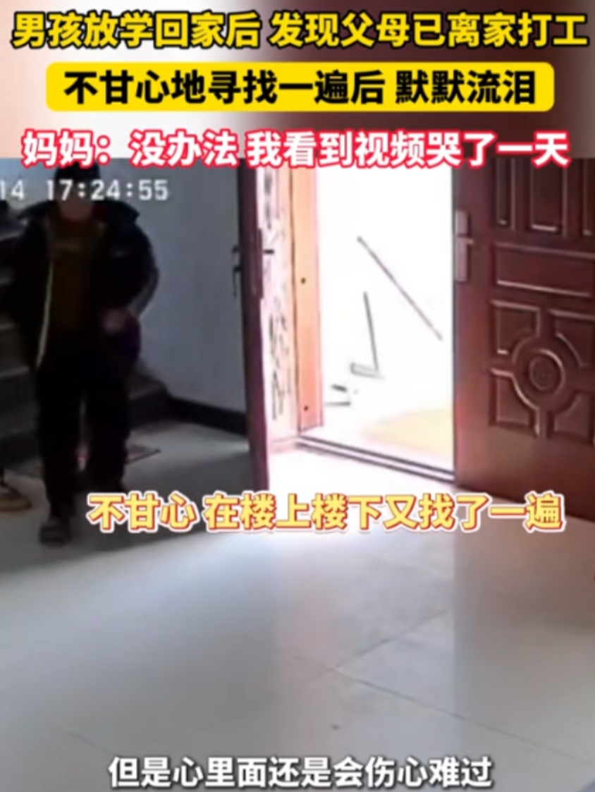 “令人心疼”河南商丘,一小学生放学回家后,不停的在家中呼喊爸爸妈妈,结果等待他的却是空无一人的房间,爸爸妈妈的行李也全都不见,最后,泪流满面的小学生对着监控大喊:“爸爸妈妈,我回来了!” 2月14日,有位在外务工的网友放出了一段自家的监控视频,并在评论区留言:“看到孩子这样,我真的很心疼,也哭了整整一宿,明年我一定要想办法留在家乡打工!” 原来这段监控视频的内容是一个小学生,只见14号下午五点半左右,一个穿着校服背着书包的小男孩走进家门。 他一进家门就开始大喊:“爸爸妈妈,我回来了!”,但他等了一会儿后,并没有等到任何回应,于是他不死心的在屋里到处寻找。 但他翻遍了屋里的每一个角落,都没有看见爸爸妈妈的身影,当他打开主卧的房门后,发现屋里已经没有了任何东西,父母显然已经带着行李外出打工去了。 于是小男孩强忍的泪水再也憋不住流出了眼眶,甚至因为太过悲伤,直接蹲在地上痛哭起来。 他一边哭一边抱怨着:“为什么你们又走了,又留我一个人在家,我也想和你们一起走”,小男孩不知道什么叫做外出务工,他只知道过完春节就又要和父母分开。 所以他非常难过,在地上哭了一会儿后,又不死心的在屋里到处寻找,就连柜子里和床底下都没有放过 此刻他还抱有幻想,希望这一切都是父母的玩笑,他们只是躲起来逗他玩的。 但当所有角落都被翻遍后,他只能认清现实,一个人走到监控下,对着监控说:“妈妈,我回家了。” 这一段不到五分钟的视频,让孩子的母亲哭了整整一晚,如果不是生活所迫,谁愿意与自己的苦肉分离呢。 同时很多看到这段视频的网友也留言表示,自己就是外出务工的家长,每年离开家里的时候,心都跟撕裂一样痛苦,尤其是看到孩子大哭不舍的样子,更是万分难过。 他们在外打工,就是为了给孩子一个更好的物质生活,但同时这也意味着他们必须舍弃亲子之间的团聚时光。 还有网友留言:“我从小就是留守儿童,所以长大后跟父母关系并不好,现在也是在外打工,很少跟他们联系,也很少回家。” 所以从这名网友的留言就能够看出来,留守儿童因为从小没有父母的关爱,所以对亲情观念十分淡薄,这不仅对自己是一种伤害,对父母更是一种痛苦。 所以如果有条件的话,把孩子带在身边打工,远比让他们当留守儿童好许多,只要一家人在一起,无论遇到什么样的困难都可以克服! 那么你们认为外出打工应该把孩子留在家里吗?把你们的看法留在评论区,让我们一起讨论一下。