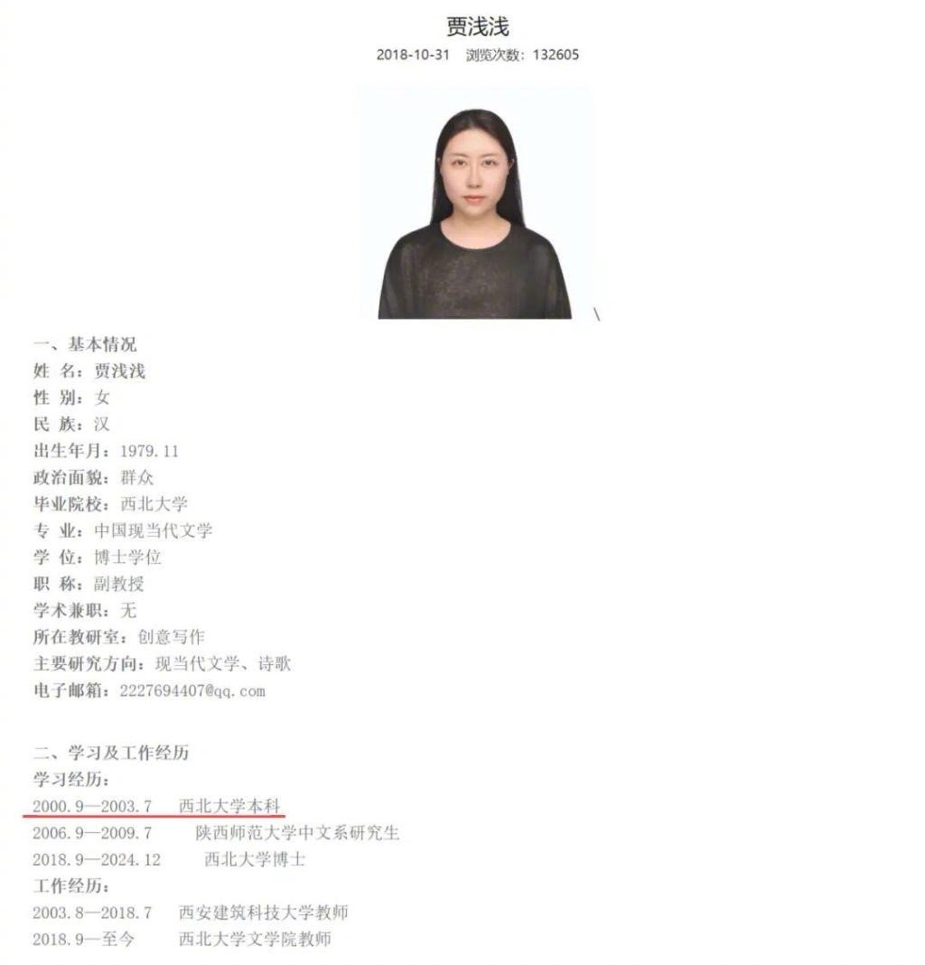 根据西北大学文学院官网简历,出生于1979年11月的贾浅浅现任西北大学副教授,隶属创意写作教研室,主要研究方向为现当代文学、诗歌。她于2000年9月至2003年7月本科就读于西北大学,2006年9月至2009年7月研究生就读于陕西师范大学中文系,2018年9月至2024年12月博士就读于西北大学。2003年8月至2018年7月,贾浅浅担任西安建筑科技大学教师,后于2018年9月起在西北大学文学院任教至今。