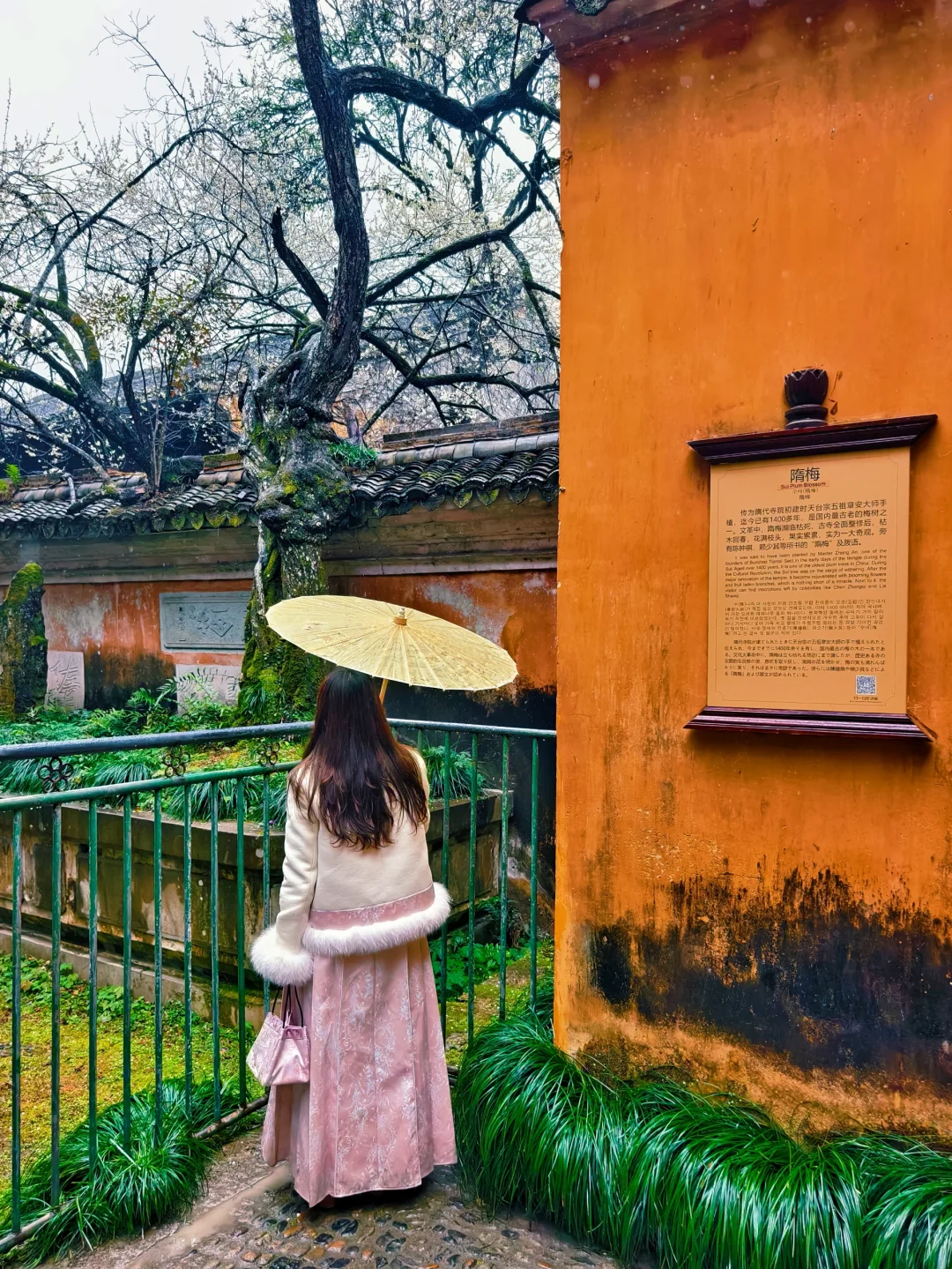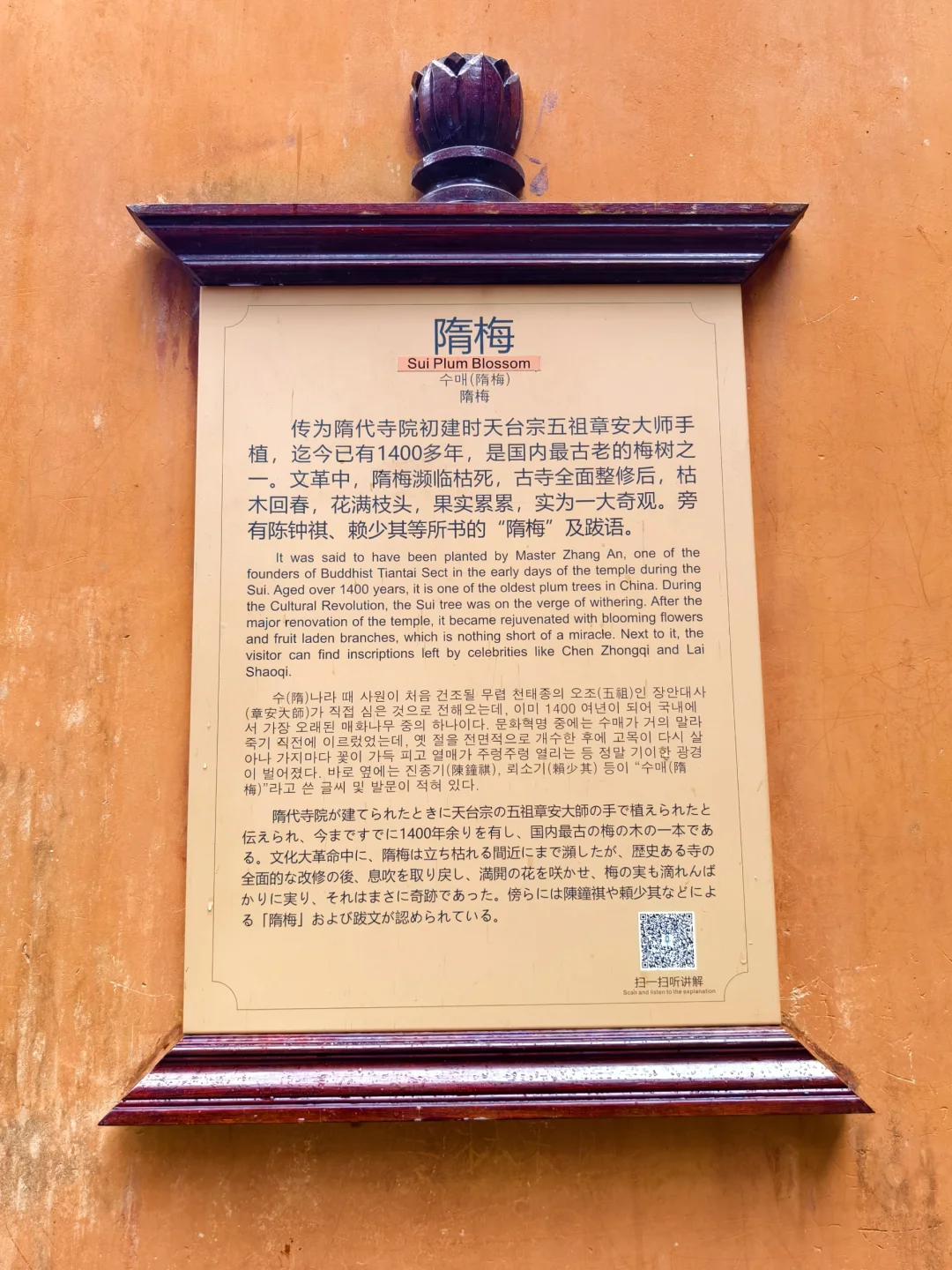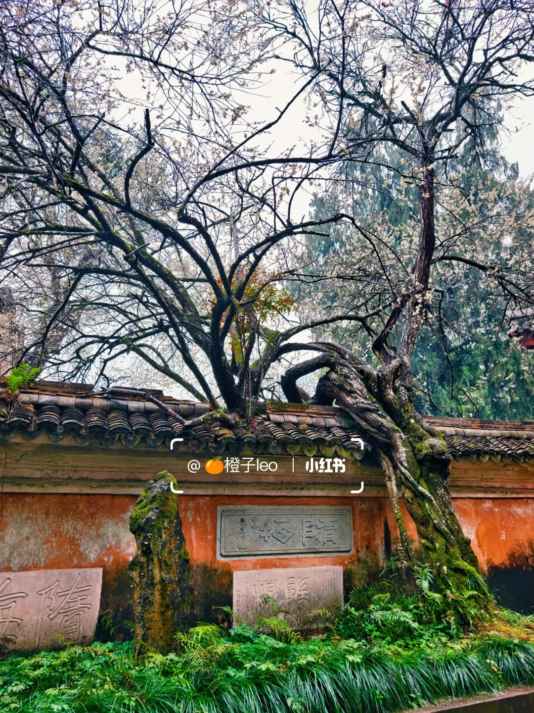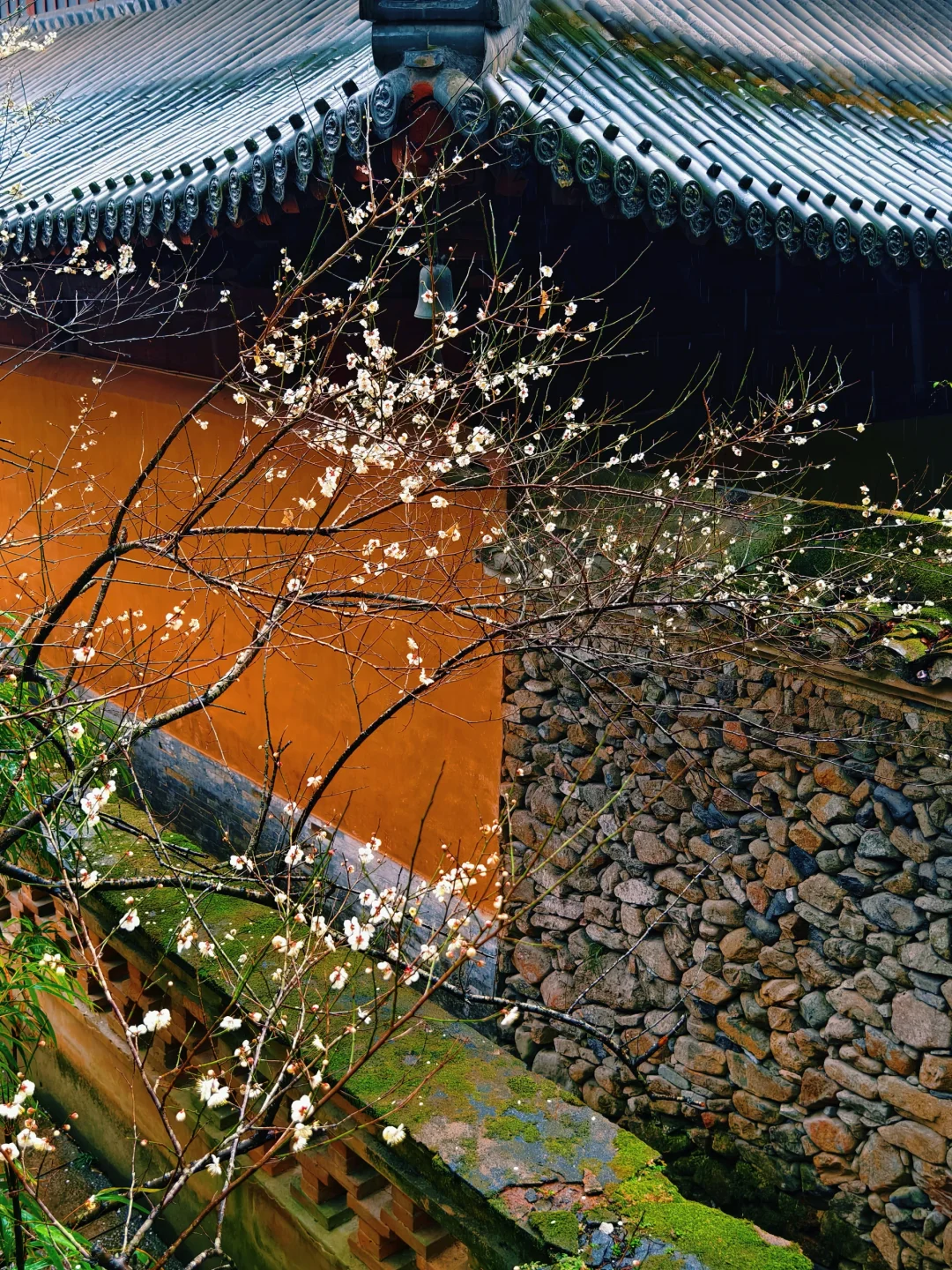 🔥隋梅,是寺庙里种植的一棵开白花的古梅,相传是该寺开山祖师、隋代僧人章安所植,同样也有1400多年历史了,是国内三株最古老的梅树之一。隋梅高10米,古干虬枝,犹似千年古藤。