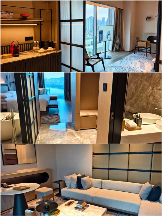 订普通房,升级到了72平的豪华套房,进门是一个迷你吧,左边通往卧室,右边通往客厅,整体长条形的布局,个人挺喜欢这种格局的,分区更明显。