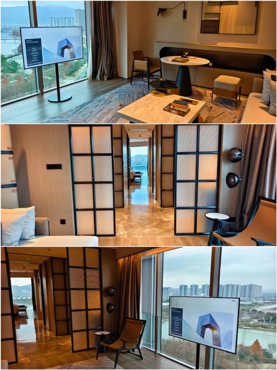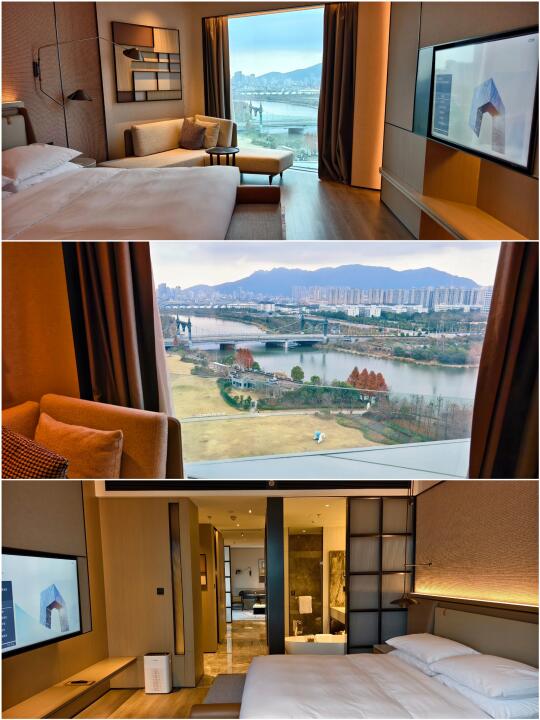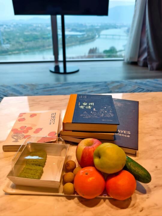 客厅和卧室都是落地窗,窗外景观是发源于黄岩区的永宁江,远处还有山景。欢迎水果中有柑橘之乡黄岩的特产蜜桔。 (P5~P10)。
