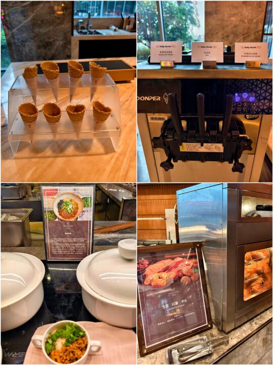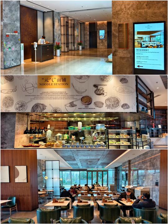 早餐在一楼的“食光”餐厅,有一些台州的特色食物,如:姜汤面、肉末炊饭、食饼筒、鸡蛋麻糍 等,还有现烤红薯、土豆、芋头等,居然还有冰淇淋。(P14~P16)