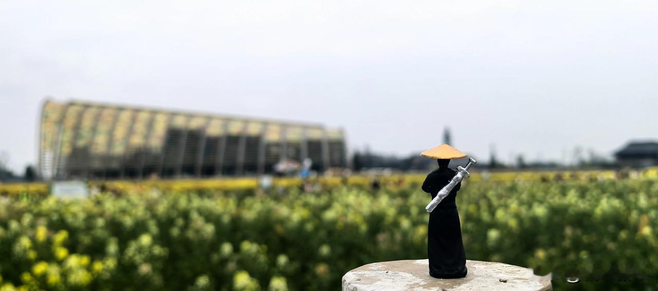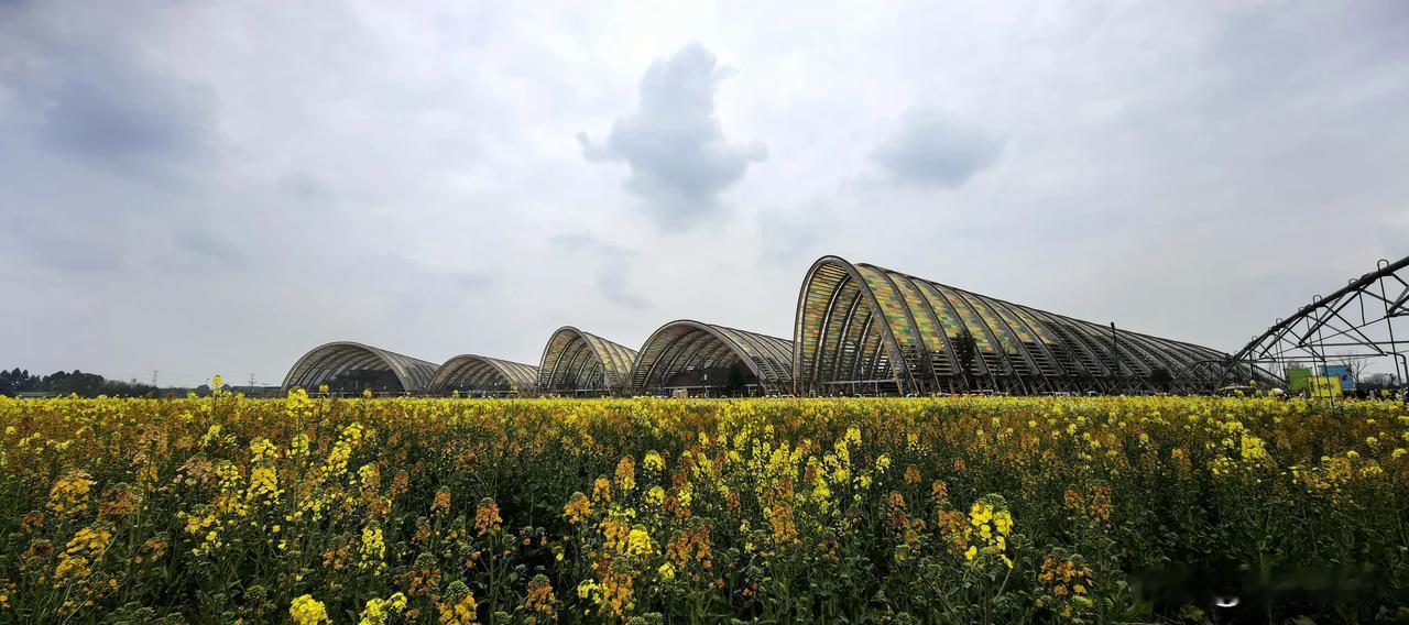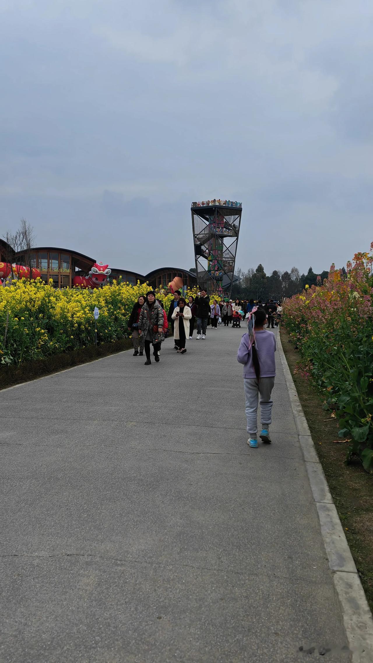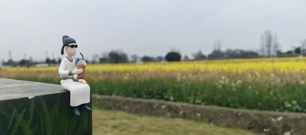 新津农博园,春天里特别的浪漫。 五颜六色盛开的油菜花到处妆点。 偶遇拿着奶茶的李白,快意泯恩仇的剑客。成都春日油菜花