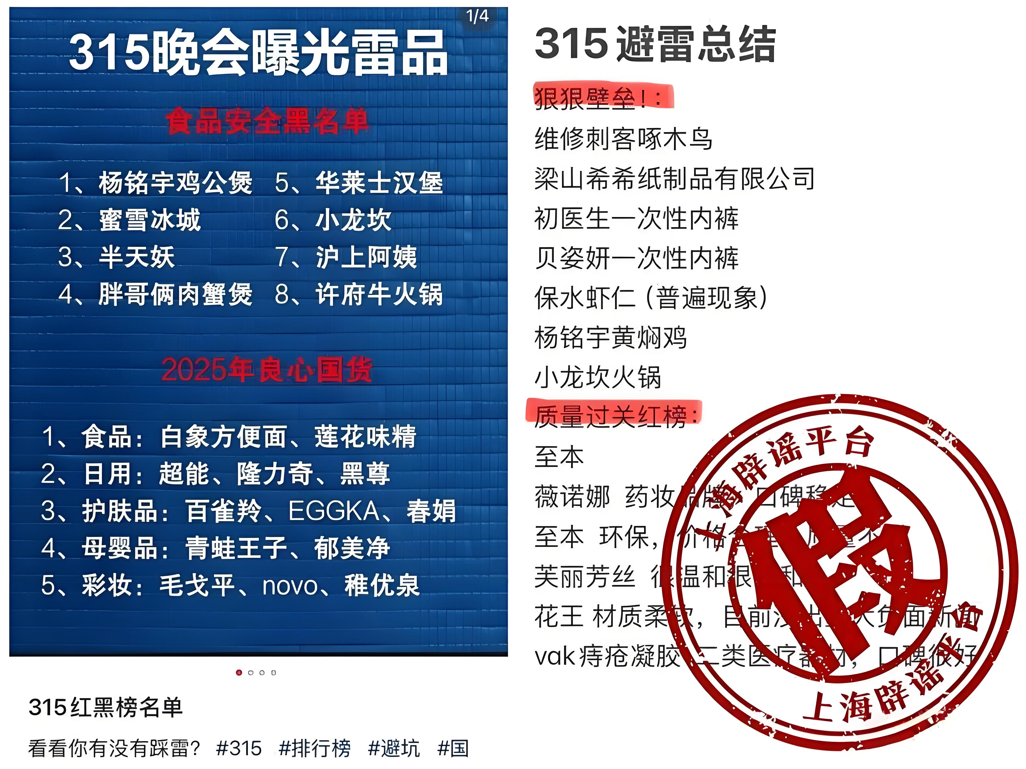每年315期间,各种所谓的“315红黑榜”在网络和社交媒体上泛滥。然而,这些榜单大多漏洞百出,与央视315晚会内容毫无关系。部分营销号利用公众对315的高度关注,编造“红榜”,将某些企业包装成行业典范,吸引消费者购买,从而赚取推广费用。这种行为不仅误导消费者,还可能让消费者为虚假宣传买单。 实际上,真正的315红黑榜往往由权威机构或官方媒体发布,通过严格的调查和评估,为消费者提供可靠的消费指南。因此,消费者在面对各种“315红黑榜”时,应保持警惕,仔细甄别其来源和内容,避免被虚假信息误导
