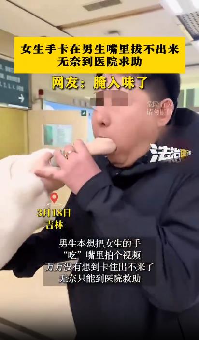 3月18日,吉林某医院上演一起离奇的事件。一男子与女生在闲暇之余,突发奇想,想要拍摄一段有趣的视频。男子将女生的手放入自己口中,试图做出一种夸张的“吃手”动作,以博取一笑。然而,就在拍摄过程中,意外发生了——女生的手被男子的牙齿和口腔结构紧紧卡住,无论如何用力都无法拔出。他们尝试了多种方法,如轻轻拉扯、涂抹润滑油等,但均未能奏效。随着时间的推移,女生的手部开始感到不适,男子也意识到问题的严重性,于是决定前往医院寻求专业帮助。 医生经过初步检查发现,女生的手被男生的牙齿紧紧咬住,形成了一种难以解脱的“锁定”状态。经过医护人员的共同努力,最终成功将女生的手从男生的嘴里安全拔出。 女生的手部并未受到严重伤害,只是因长时间被卡导致轻微肿胀和不适。医生提醒,此类看似无害的玩笑行为实则存在很大风险。口腔内的牙齿和口腔结构复杂,一旦手部被卡住,很容易造成伤害。