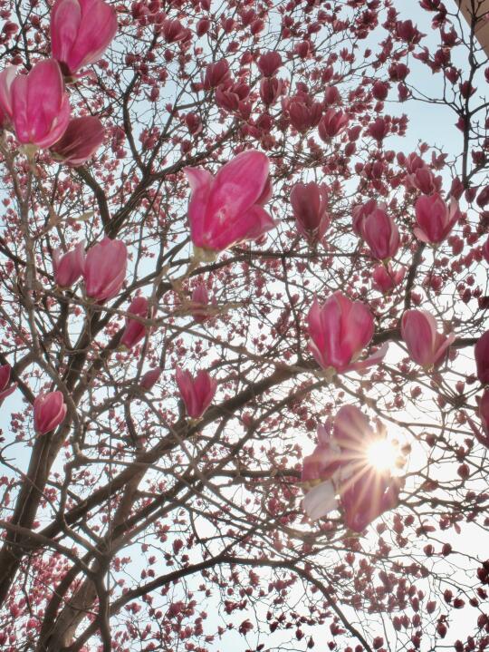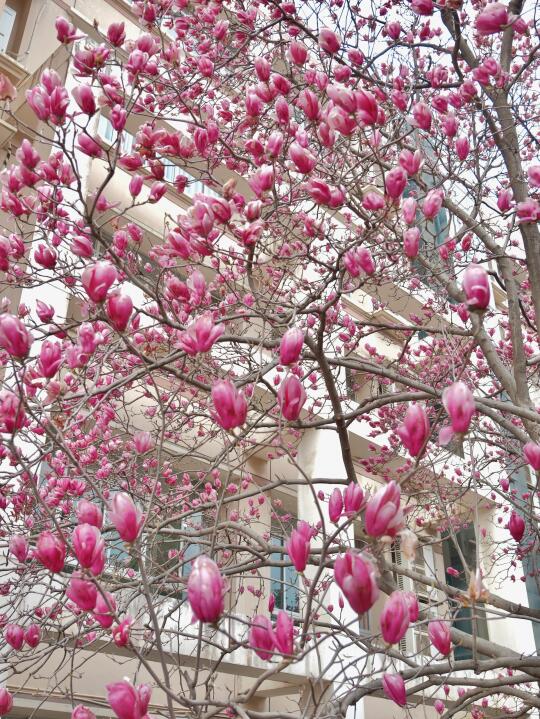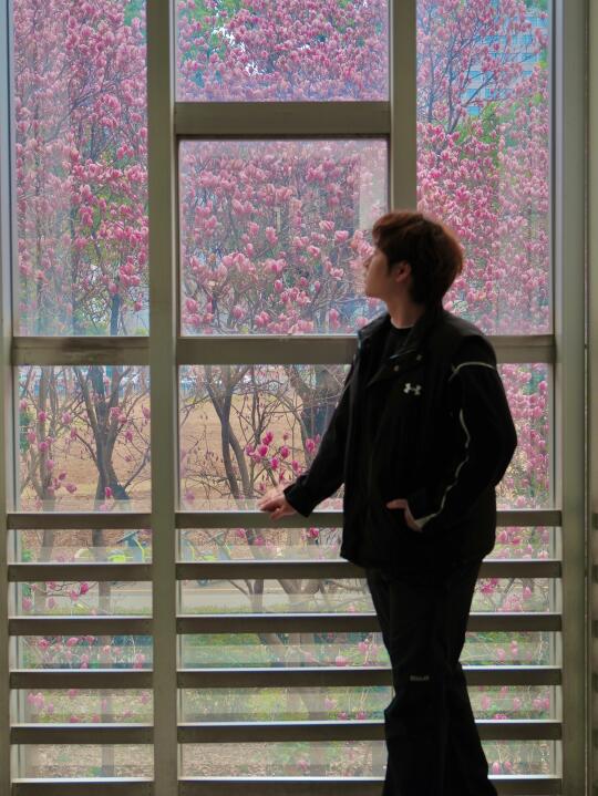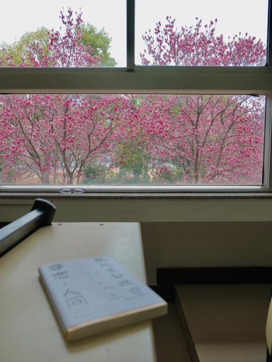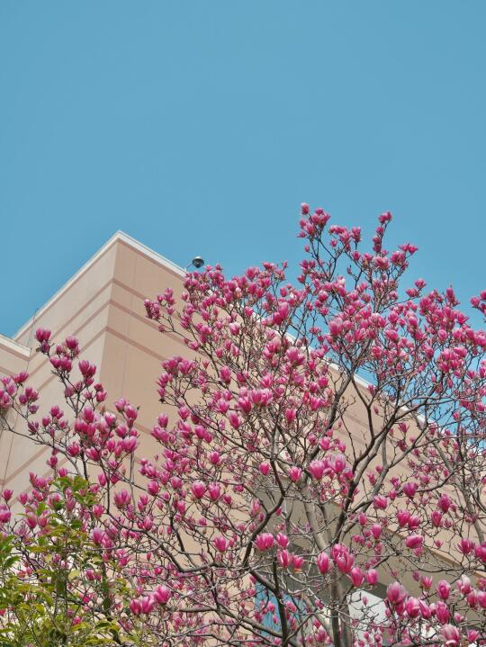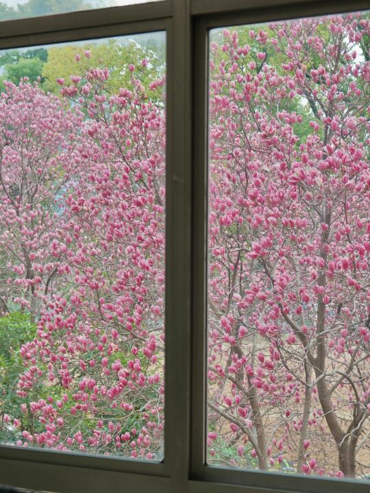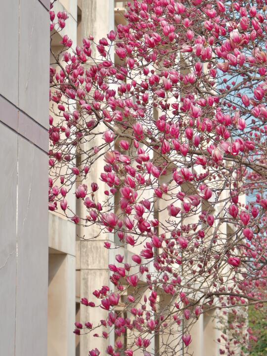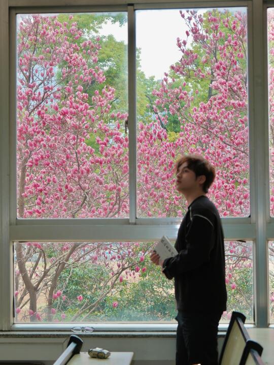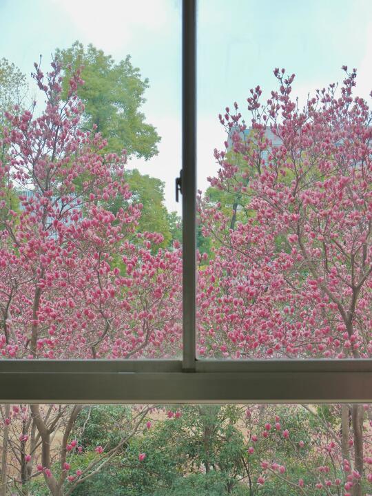 华中科技大学[搜索高亮]西十二楼的玉兰已开成一片“流动的云”!走廊落地窗外,浅紫与粉白花瓣与玻璃幕墙相拥,倒影如对称的莫奈画作。坐在教室凝神,抬眼便是满窗春色——风起时,花枝轻叩窗棂,光影在课桌上跳跃,随手一拍即是“玉兰与窗”的诗意构图。教学楼外,30余株玉兰连缀成200米花瀑,逆光拍摄时花瓣薄如蝉翼,脉络透出金色微光,宛若春日写下的透明情书。