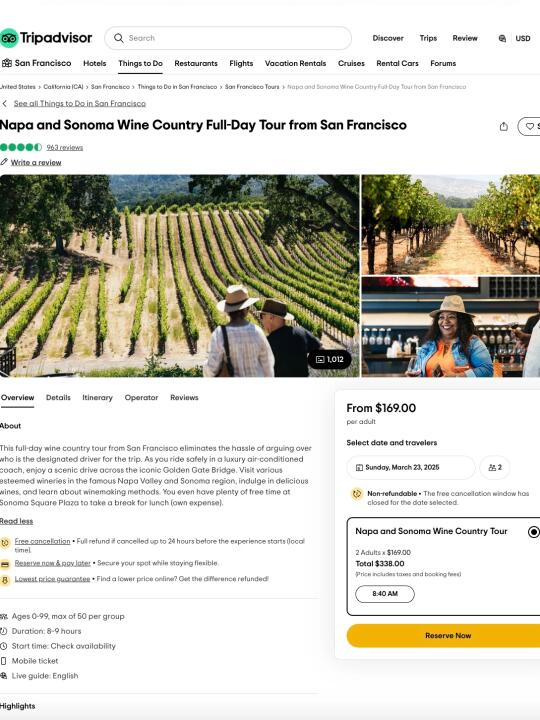 🌟纳帕谷拥有400多家酒庄,其中包括不少世界知名品牌,他们也很欢迎游客参与酒庄品酒体验,了解酿酒工艺。而我报的这种一日旅程就很适合来旧金山出差或者短途游的伙伴!携程或肥猪可以定,但那个因为时差原因可能订不到次日的,也不允许退票。建议英文ok的朋友可以上Tripadvisor定当地的旅行团(图17),个人觉得会更好玩一些!顺便可以碰到不同国家的伙伴一起聊天——我报的团就碰到了韩国、加拿大、巴西、印度、法国、比利时…