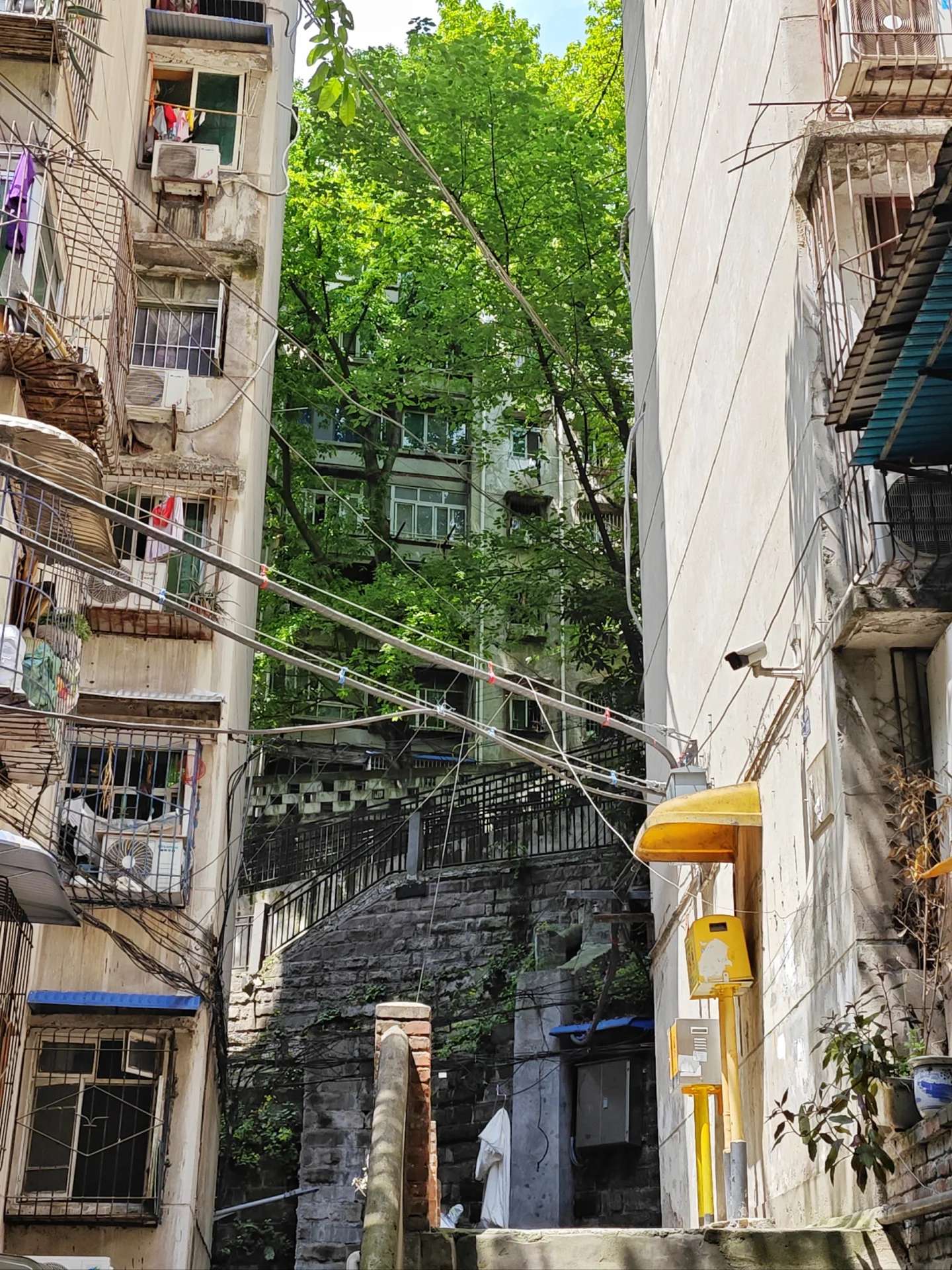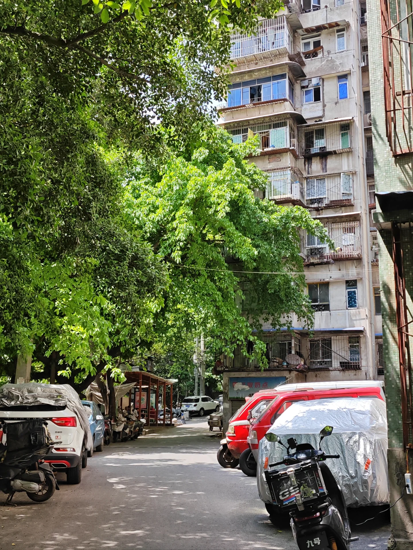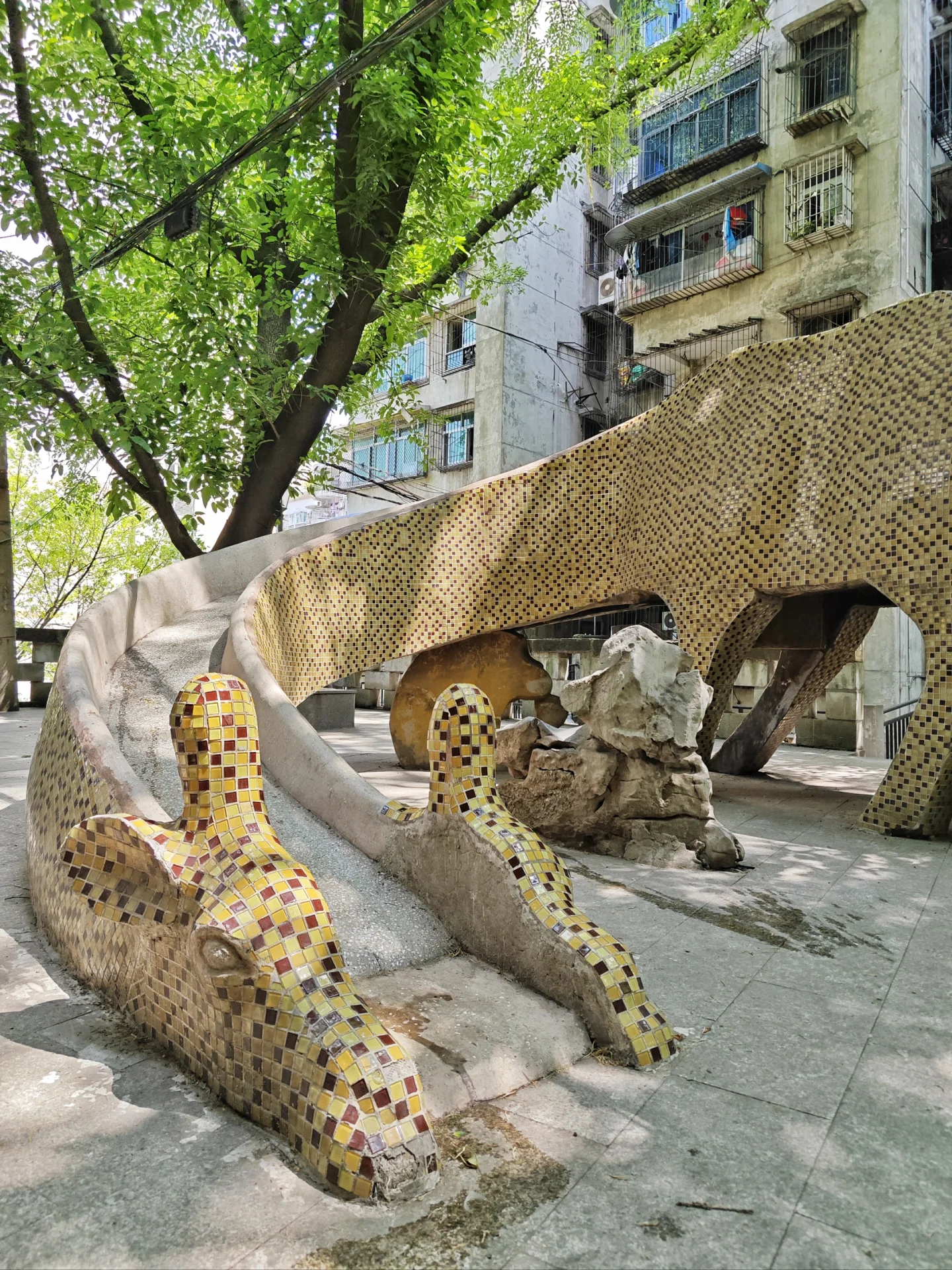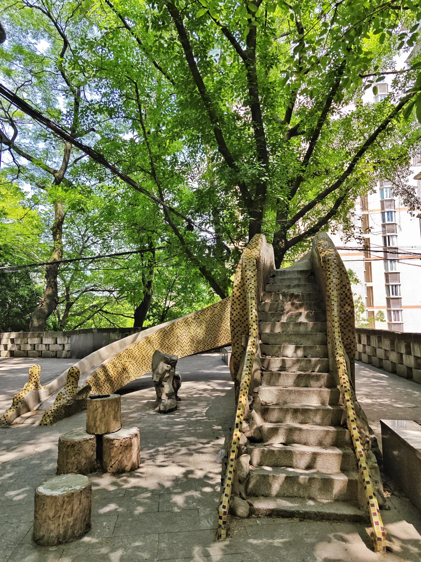 五一新村其实前几年就去过,也发过,但当时主要在下面看红砖筒子楼,没有上到最上面,所以也没发现这个长颈鹿梭梭板。五一新村是重庆建工八建的家属区,大部分家属楼都是1980年代和1990年代修建的,只有少数几栋1970年代的红砖房。最顶上这片家属区树木茂密,绿化率很高。这些黄桷树三十几年前可能还是小树桩,但生长很快,现在已经是参天大树了。阳光透过树荫缝隙洒进来,在初夏的午后,光线很舒服,也不热。树下院落坐着两桌打扑克的退休职工,也是很享受生活了。但因为树木茂密,蚊子太多,我在那里坐了一会就被蚊子偷袭,不得不撤。