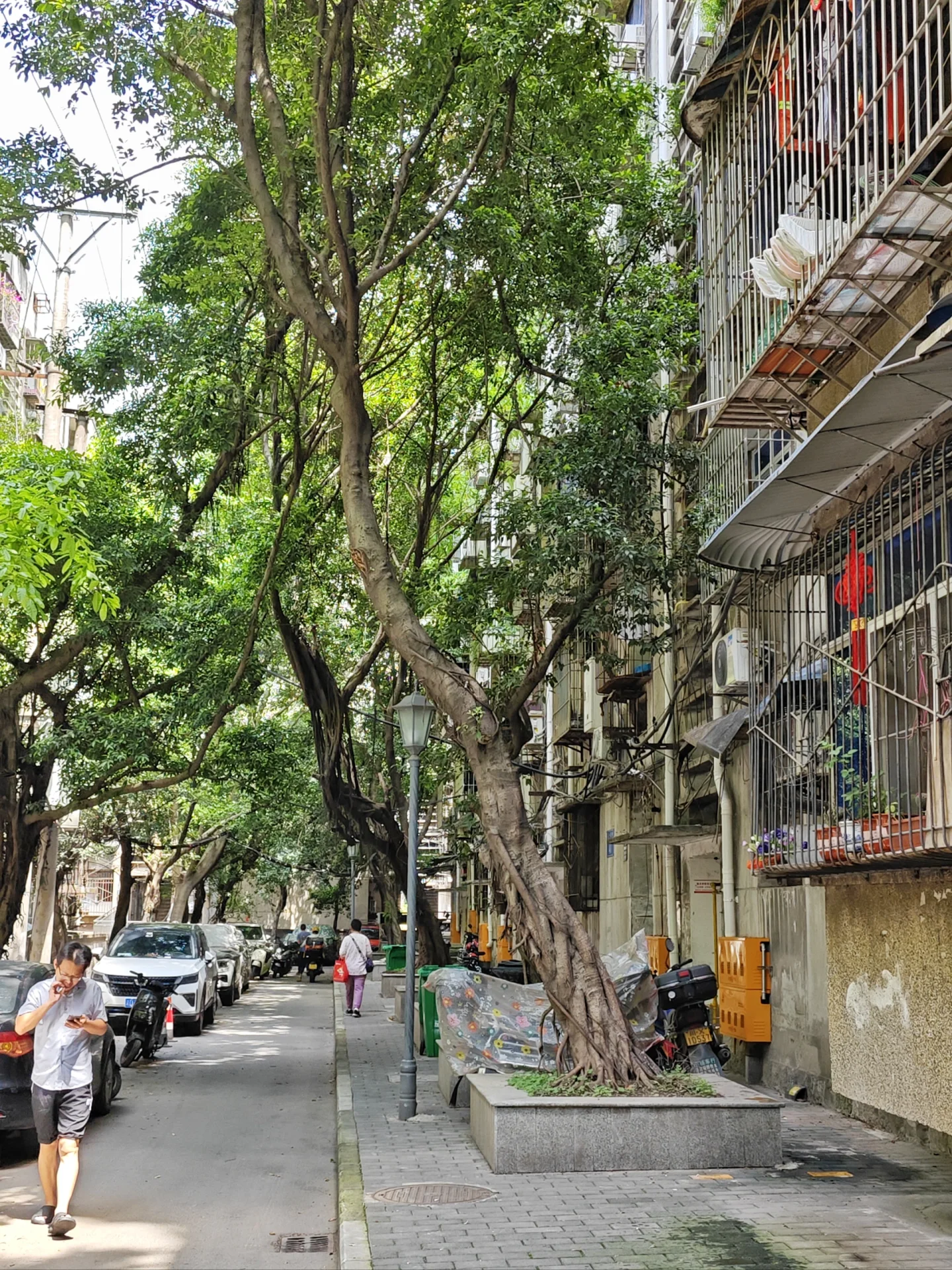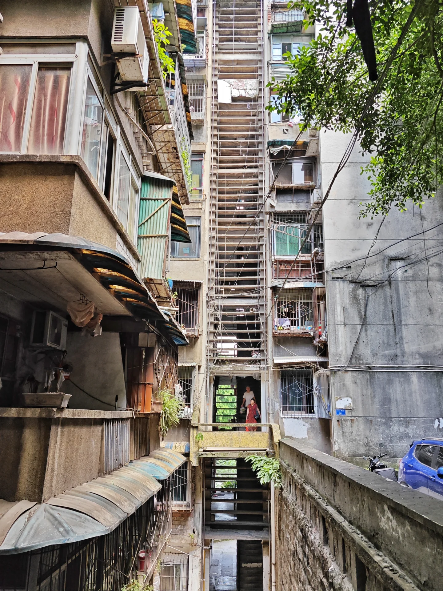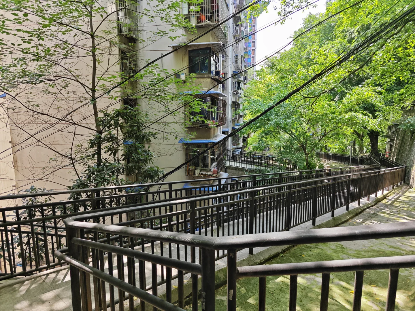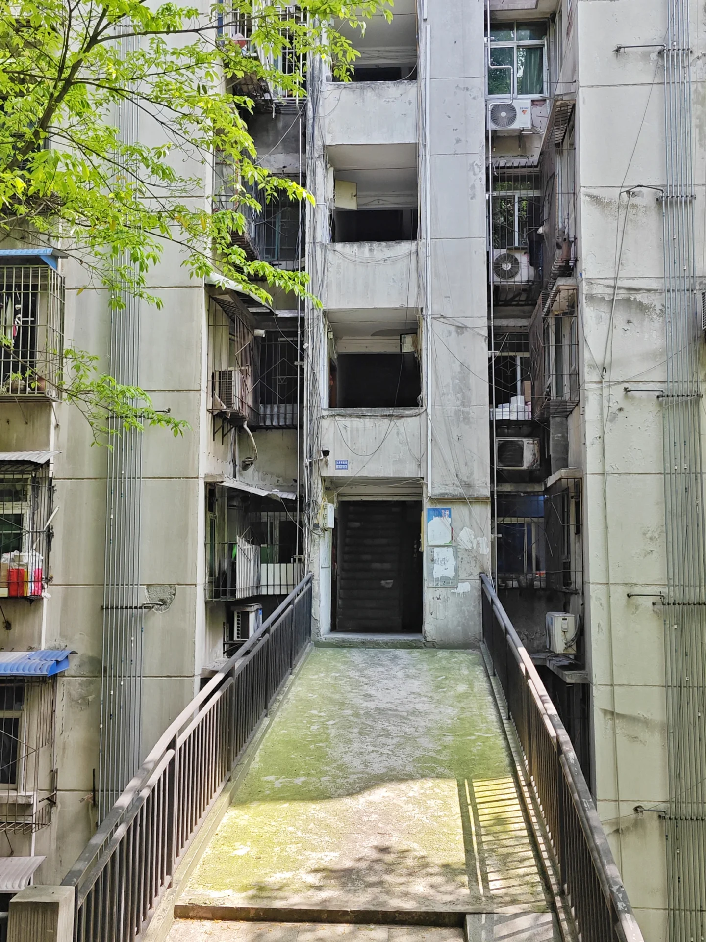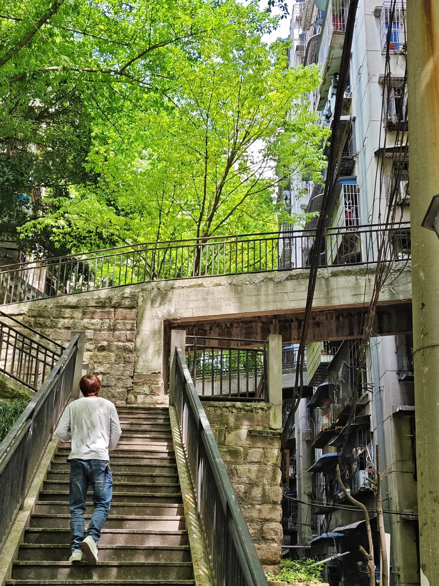 五一新村其实前几年就去过,也发过,但当时主要在下面看红砖筒子楼,没有上到最上面,所以也没发现这个长颈鹿梭梭板。五一新村是重庆建工八建的家属区,大部分家属楼都是1980年代和1990年代修建的,只有少数几栋1970年代的红砖房。最顶上这片家属区树木茂密,绿化率很高。这些黄桷树三十几年前可能还是小树桩,但生长很快,现在已经是参天大树了。阳光透过树荫缝隙洒进来,在初夏的午后,光线很舒服,也不热。树下院落坐着两桌打扑克的退休职工,也是很享受生活了。但因为树木茂密,蚊子太多,我在那里坐了一会就被蚊子偷袭,不得不撤。