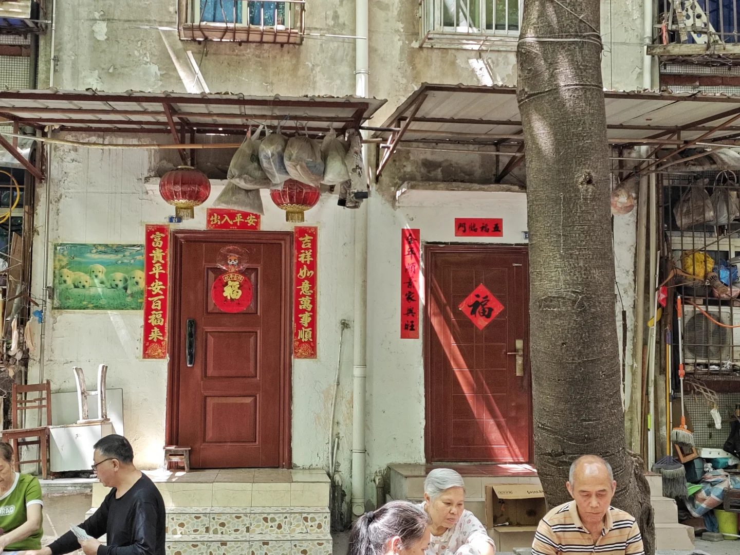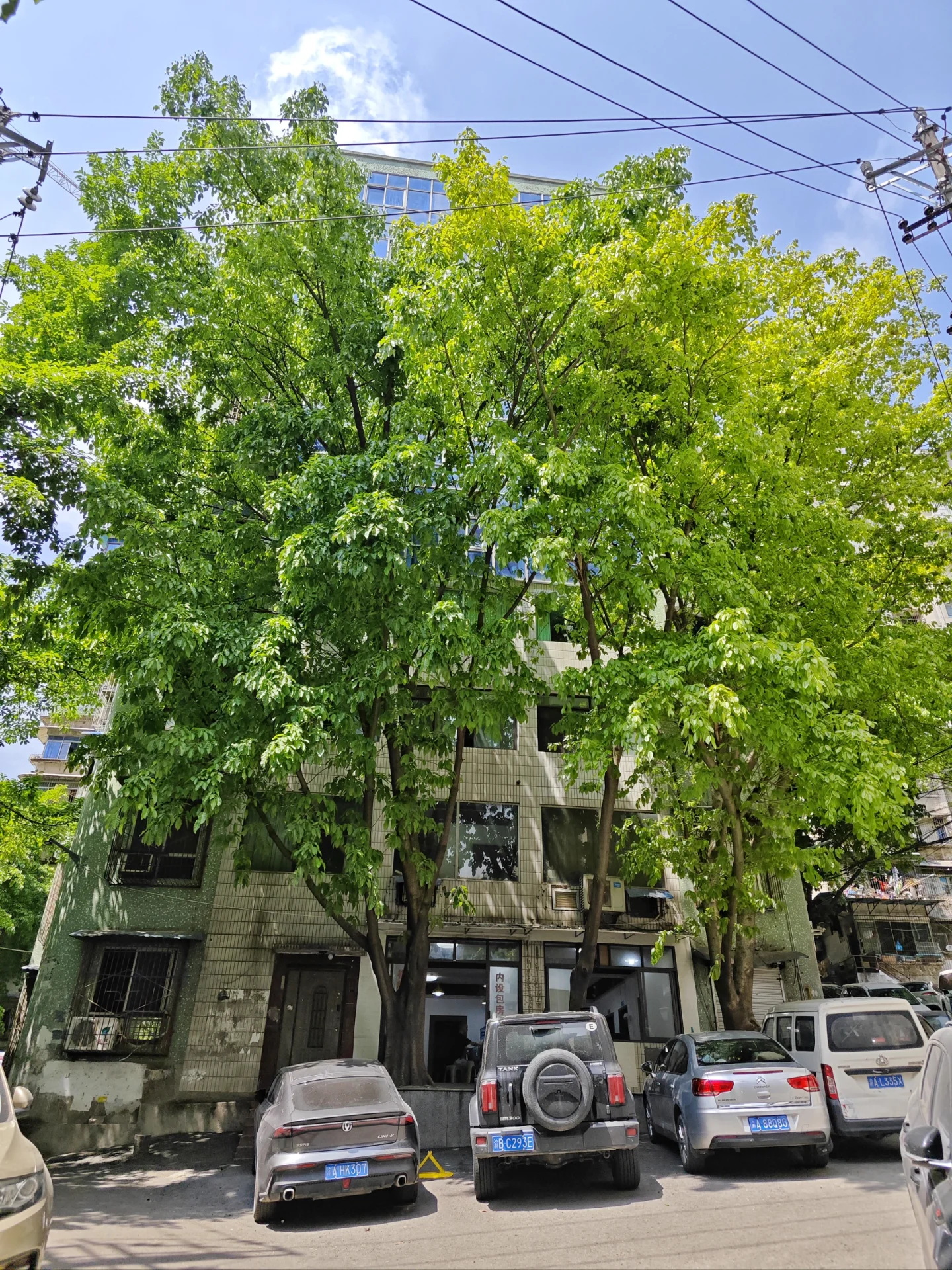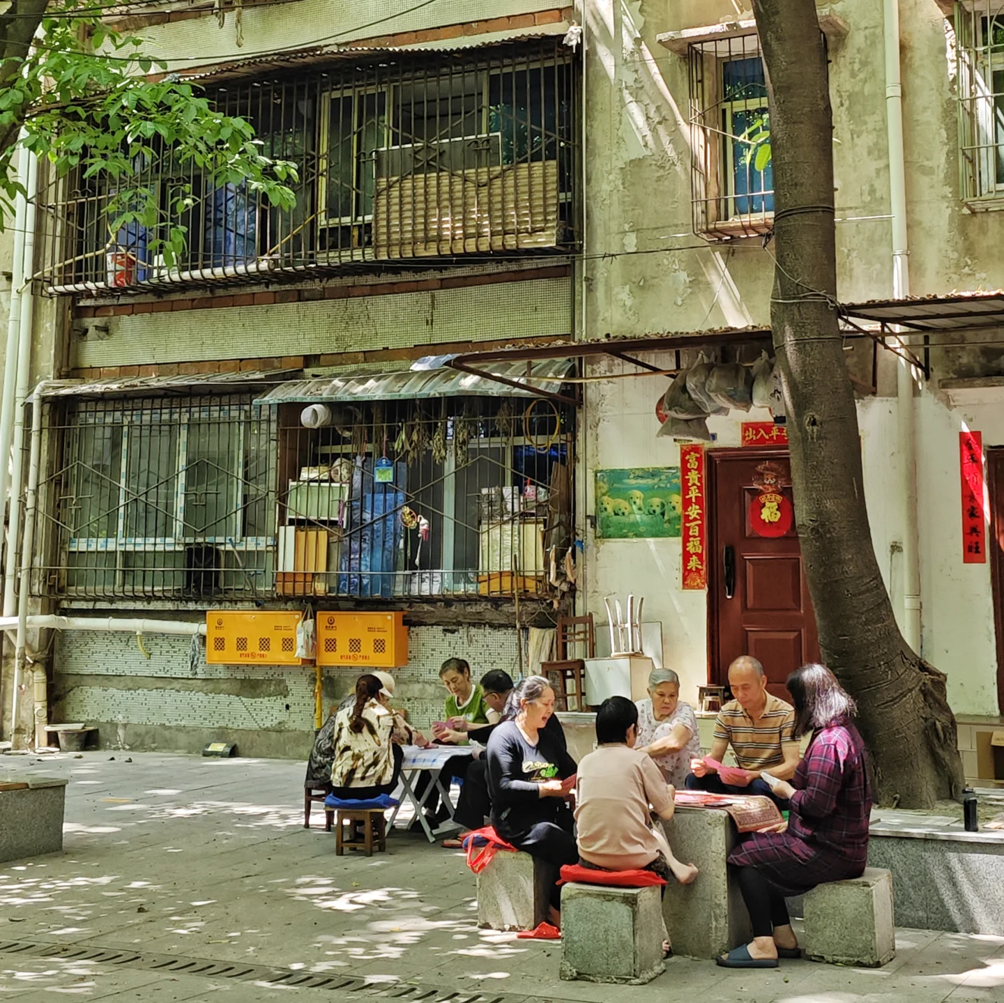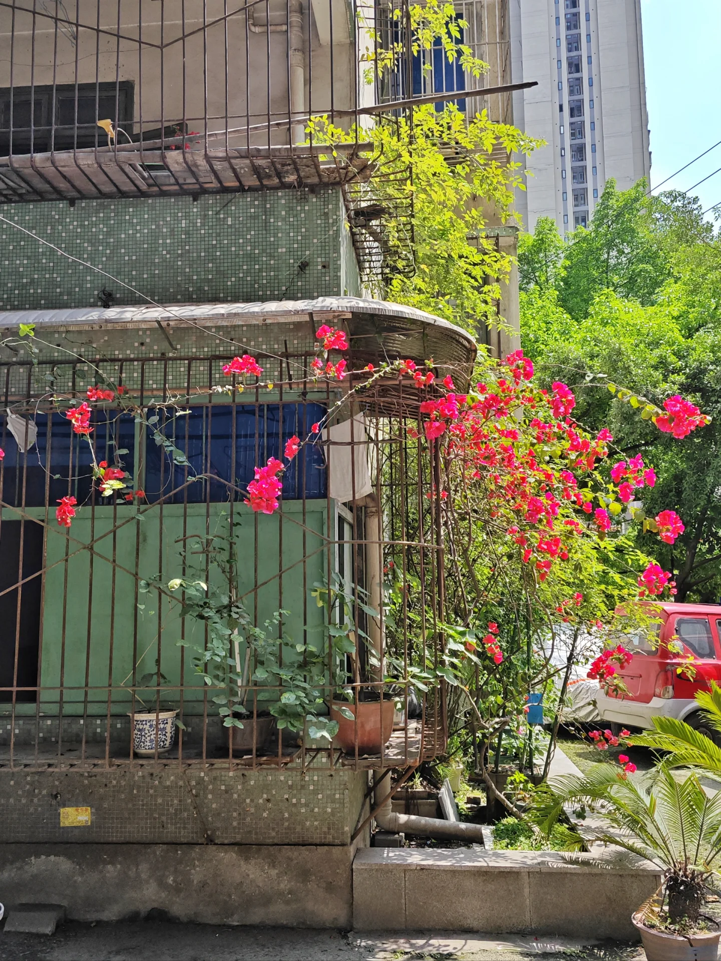五一新村其实前几年就去过,也发过,但当时主要在下面看红砖筒子楼,没有上到最上面,所以也没发现这个长颈鹿梭梭板。五一新村是重庆建工八建的家属区,大部分家属楼都是1980年代和1990年代修建的,只有少数几栋1970年代的红砖房。最顶上这片家属区树木茂密,绿化率很高。这些黄桷树三十几年前可能还是小树桩,但生长很快,现在已经是参天大树了。阳光透过树荫缝隙洒进来,在初夏的午后,光线很舒服,也不热。树下院落坐着两桌打扑克的退休职工,也是很享受生活了。但因为树木茂密,蚊子太多,我在那里坐了一会就被蚊子偷袭,不得不撤。