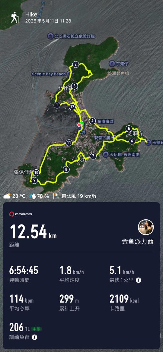下船登岛后,从长洲码头出发,顺时针方向环岛行走,整体爬升不多,边走边拍边玩,全程六七个小时