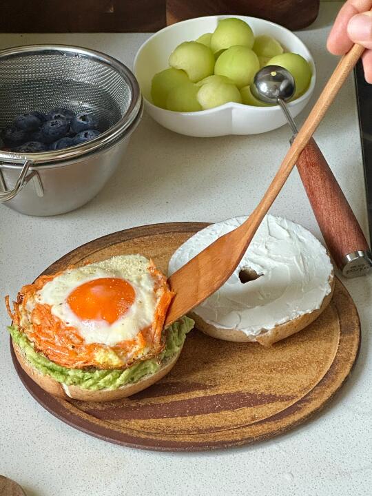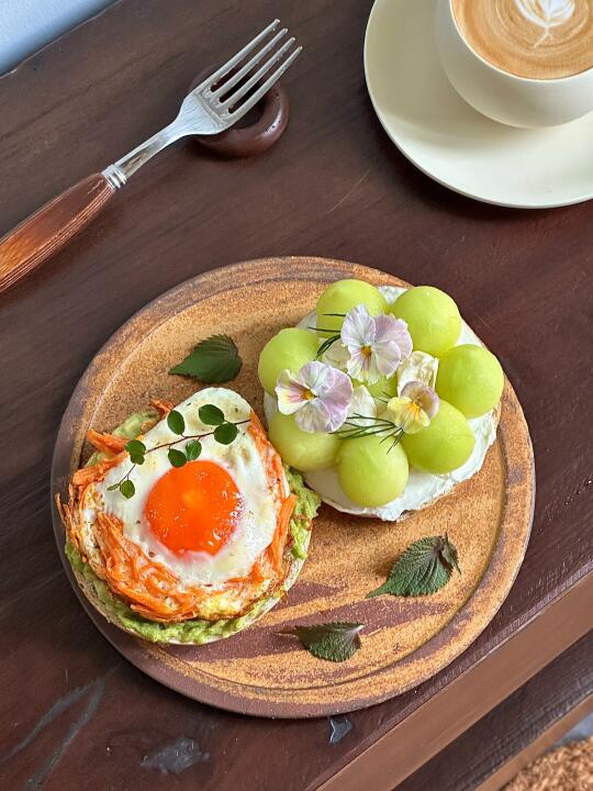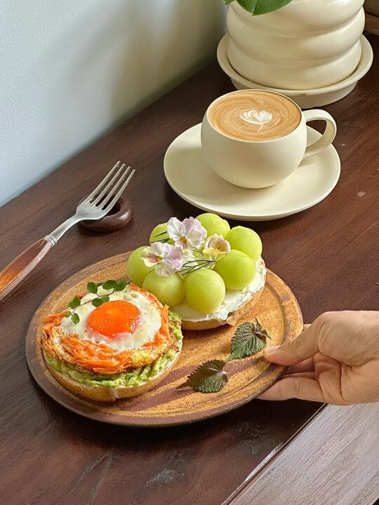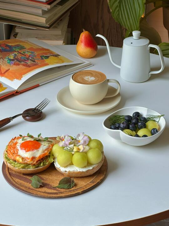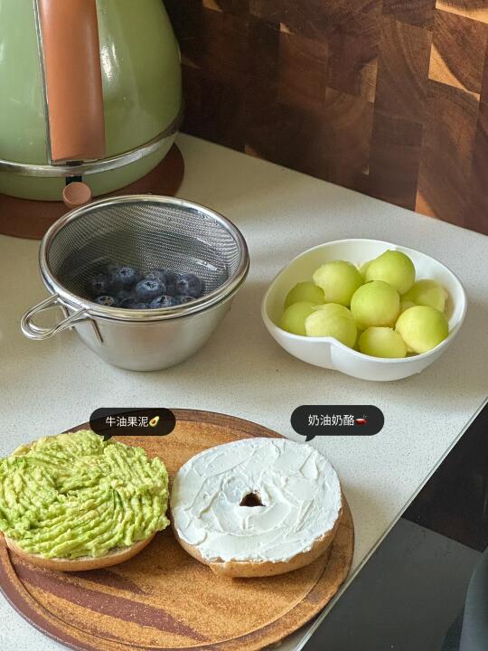 今日双拼贝果🥯 贝果+牛油果泥+胡萝卜煎蛋🍳 贝果+奶油奶酪+蜜瓜🍈 养了大半个月的咖啡豆子油光发亮✨ 来杯拿铁咖啡真正好🫶🏻