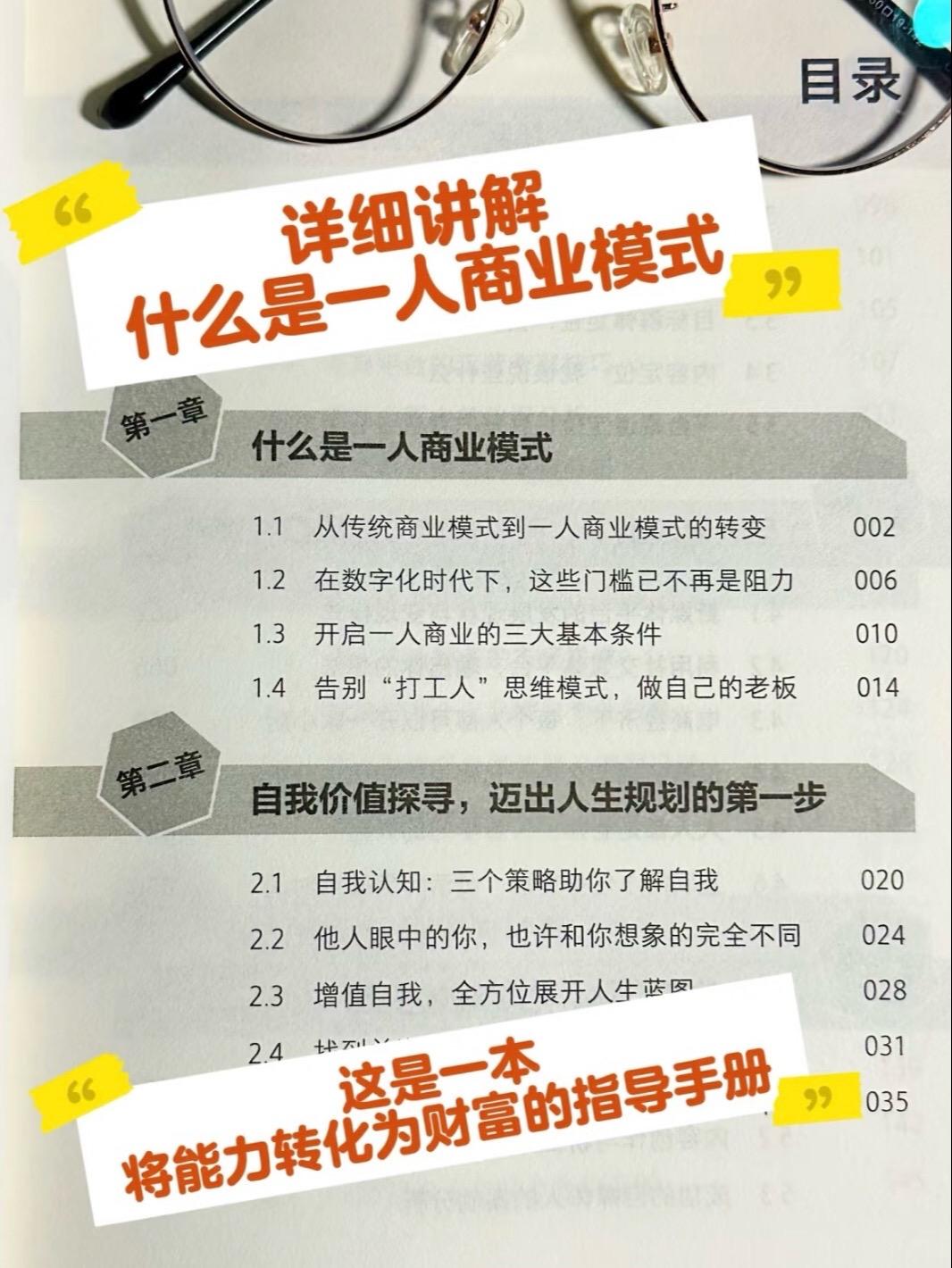 打工一辈子不如读透这本书!普通人翻身秘籍。不想一辈子给人打工,想当老板的,或者想利用零碎时间多赚点钱的,都来瞅瞅这本《一人商业模式》!这本书真挺神,不讲那些花里胡哨的大道理,实实在在教普通人怎么搞钱,虽然有些观点乍一听违反常识,但实际超有用!个人成长赚钱思维好书推荐提升自己