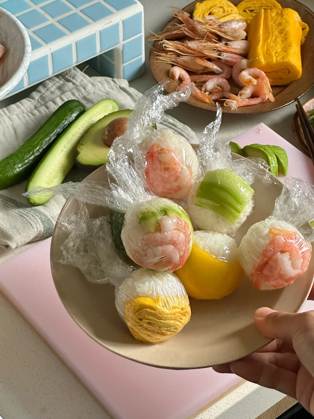·将寿司饭捏成45g的饭团,保鲜膜摆上食材,再放上米饭,用保鲜膜将食材团紧实