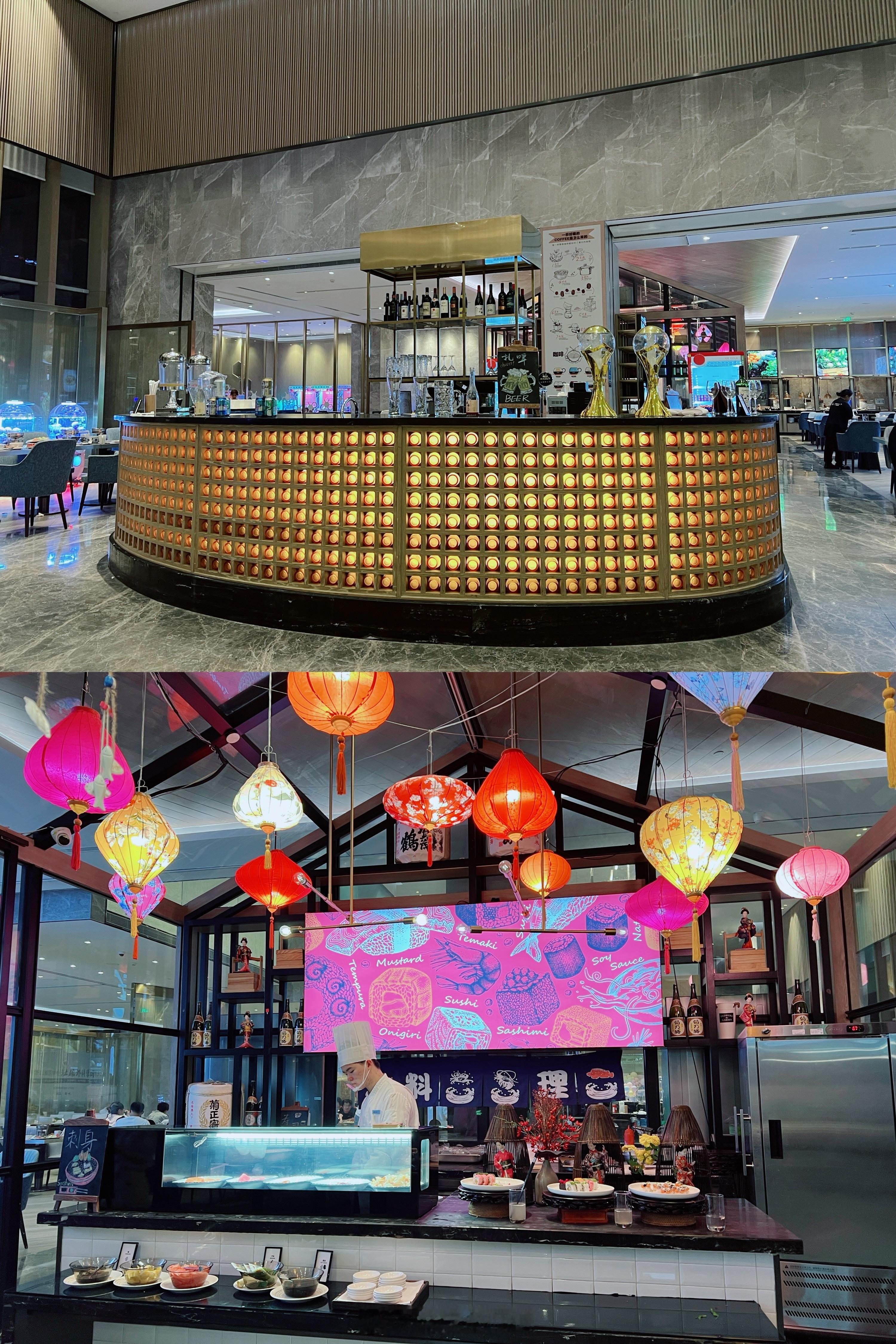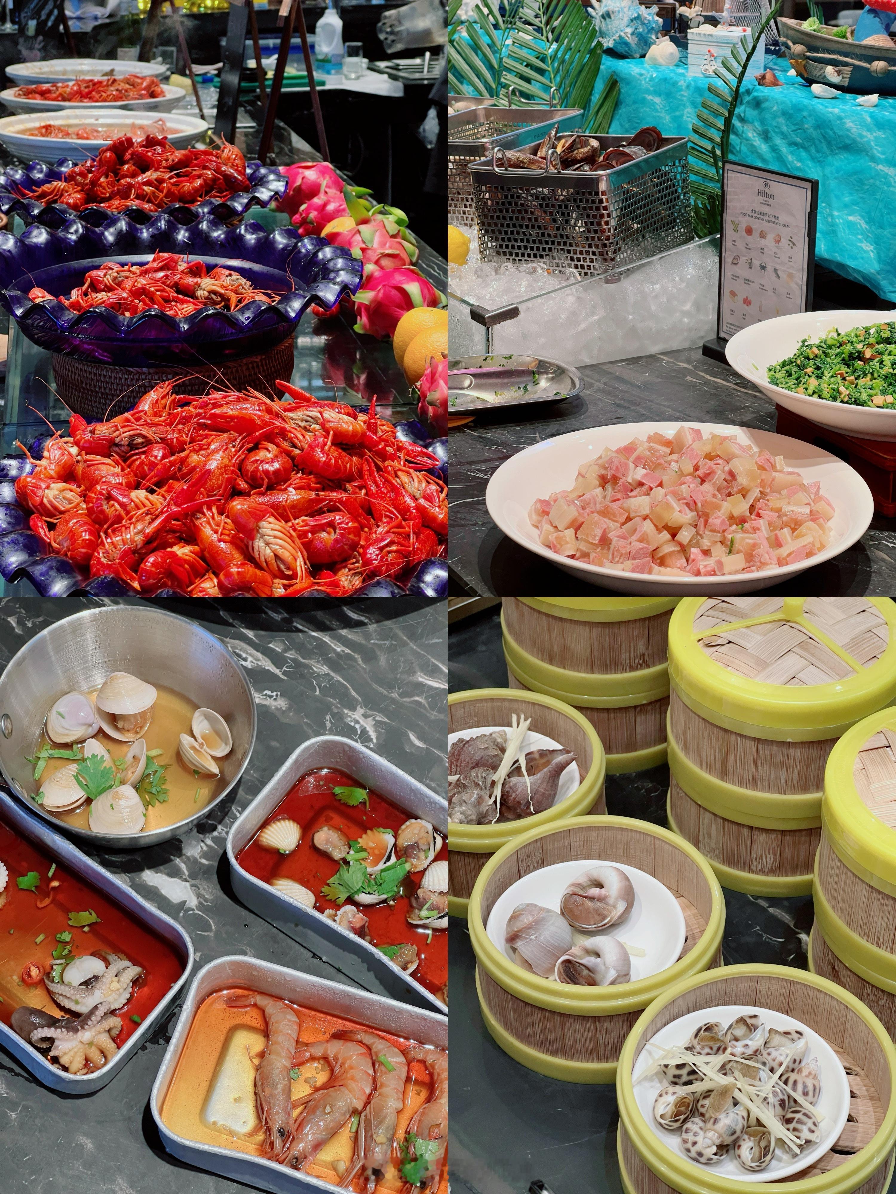 1️⃣欢全日制餐厅🍴|主餐厅,在这里吃了早、中、晚三餐。早餐有不少当地小吃,整体水准上乘,台州号称浙江糯叽叽之都,喜欢这口的会很爱;周末晚餐,两大一小598元净价,难得有几家酒店自助能供应出这种达到生食品质的三文鱼,各种口味的小龙虾也让人满足;午餐是有当地特色的台州午茶,晚餐有的大部分午餐也有,更增加了蒸点海鲜。价格还更便宜。