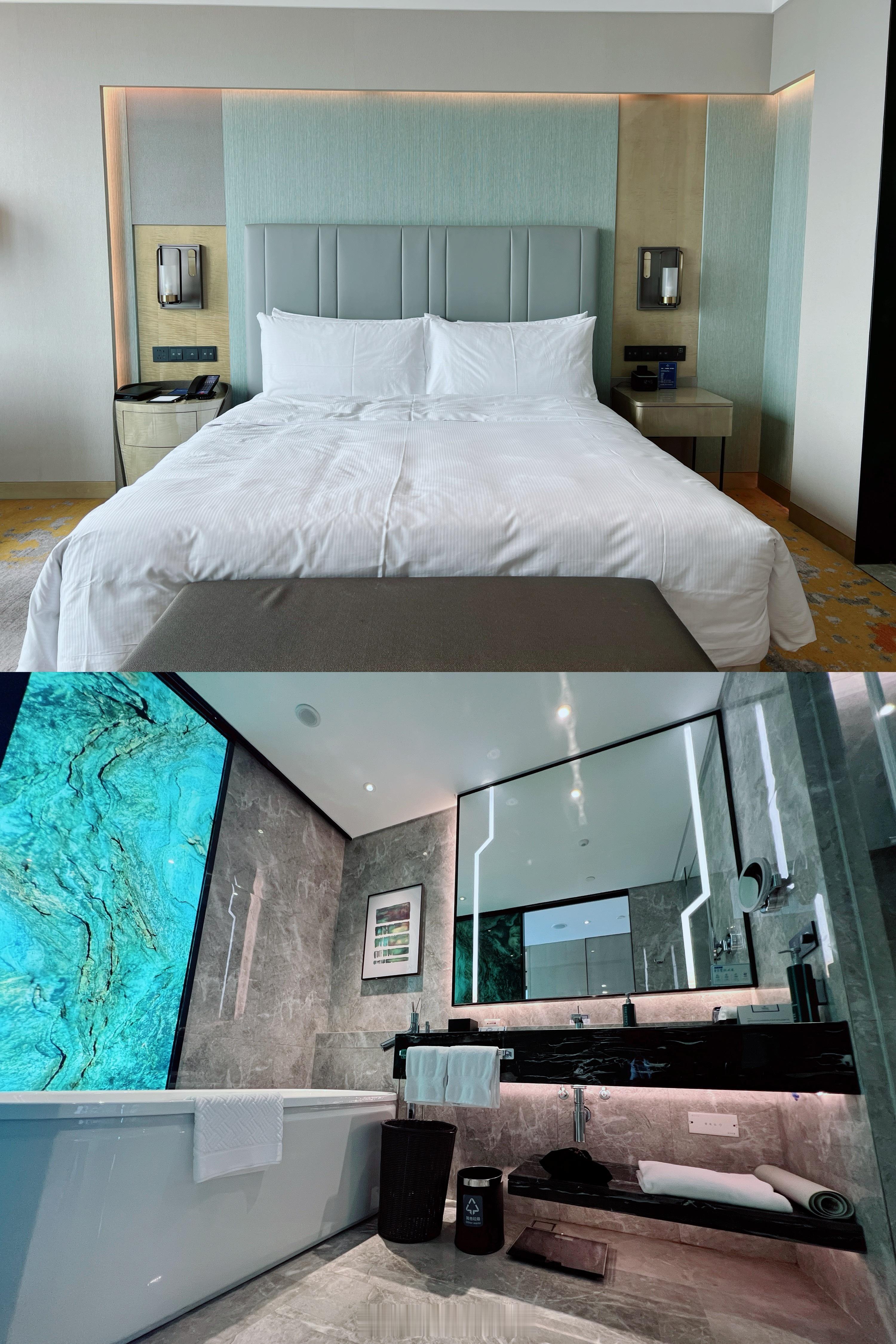 🛏️:336间(套)客房,有豪华房、行政房、豪华套、行政套和总套,最小面积46平,套房以下只有楼层和待遇区别。户型方正,装潢色调明亮,采光佳;衣帽间、浴室和电动马桶是物理分区,各自单间的互不干涉;浴室仿玉石玻璃隔断是点睛之笔;客房服务响应及时,这次来是过生日,酒店也赠送了蛋糕。