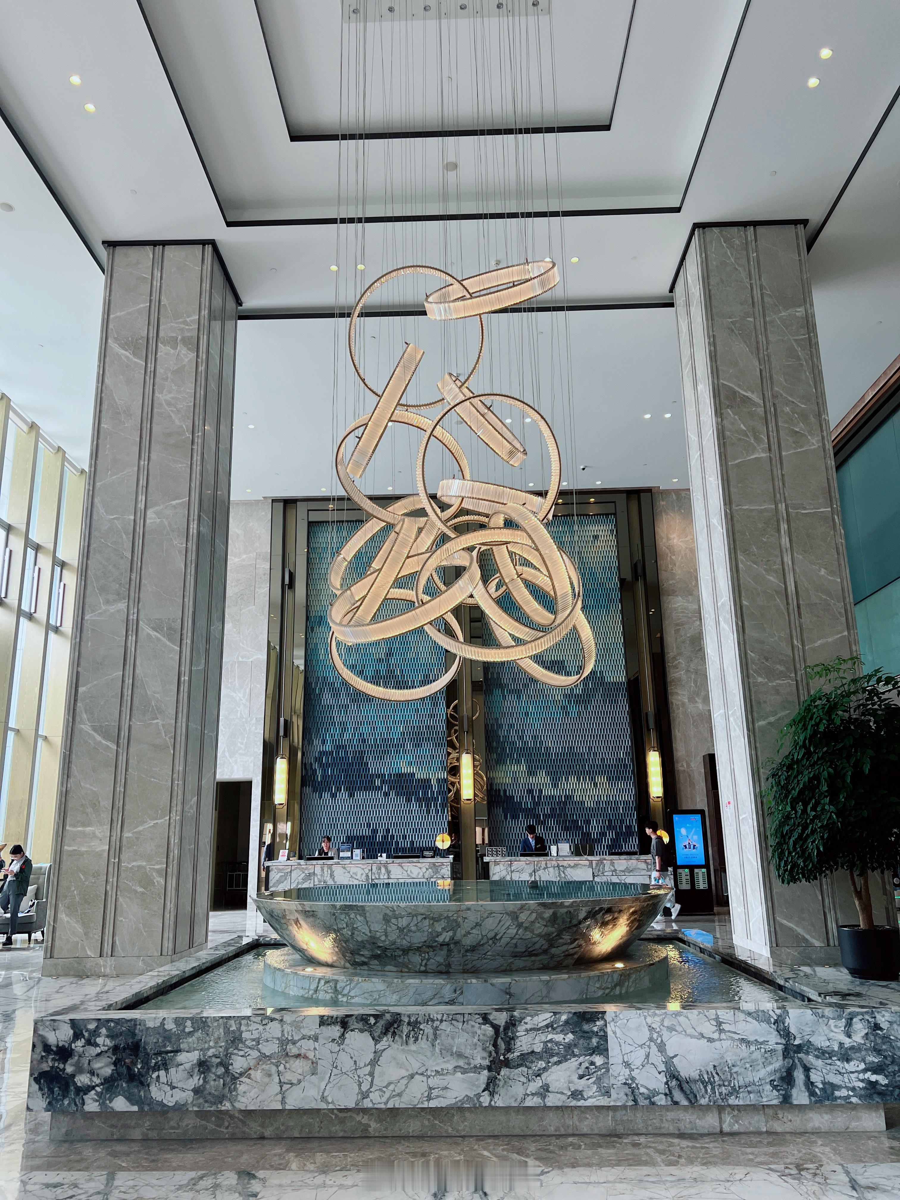 📖:2019年开业,正处于最佳赏味期,也是台州第一家国际五星,旁边就是业主的青悦城。进门就是大型水池加巨型吊灯搭配,前台马赛克墙呈现各种深蓝浅蓝的波纹,诉说着台州海洋文化。总体看,硬装采用大量的石材,从内到外都是商务酒店风格。