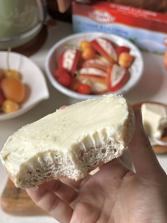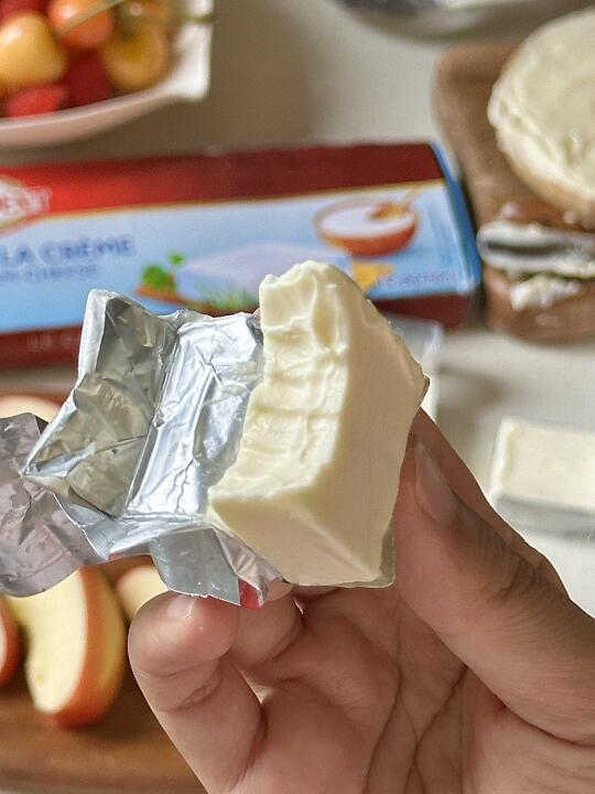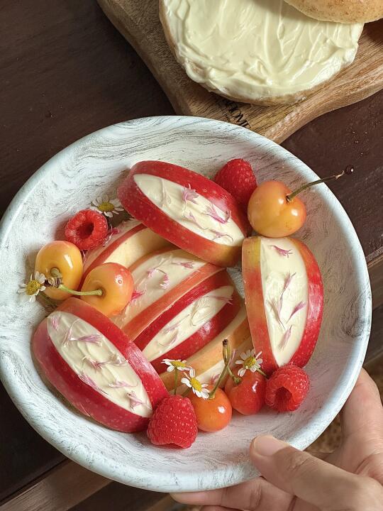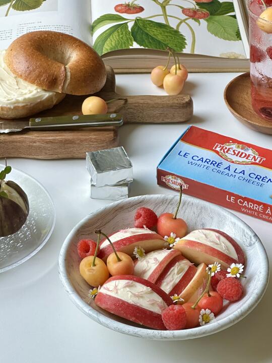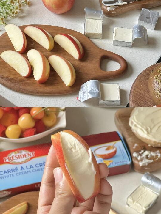 🧺好喜欢我的漂亮下午茶! 今日的漂亮下午茶🧺 🍎水果夹总统奶油奶酪 🍓树莓气泡饮 - 天气越来越热啦 下午茶也要清凉一些🍃 🍎奶酪夹水果 无花果|苹果|总统奶油奶酪|开心果碎|香草 - 今天准备了无花果和苹果做水果夹奶酪 ·无花果洗净切十字,但不要切到底,把四瓣稍稍掰开,将总统奶油奶酪填充到无花果中间,撒上一些开心果坚果碎,装饰香草,吃的时候淋上枫糖浆🍯 ·苹果切成六瓣,每瓣中间切出一个三角,在空缺处填上奶油奶酪,装饰干花就完成啦✨ - 真别说🤨 水果夹奶油奶酪,真的比夹干噎酸奶好吃太多啦🥹🥹 无花果的温甜混合奶酪的细腻绵密 苹果的酸甜清脆把奶酪的软香丝滑中和的也很到位 而且总统家的奶油奶酪,口感更顺滑绵密,更加醇厚! 奶味也特别浓郁!一口下去好吃加倍! - 我以前每次买整盒的奶油奶酪根本吃不完, 一大块吃好久还要经常打开密封,感觉很容易就会变质。 🥲但是!总统家的这个是独立分装~ 一次一块很方便🥳🥳就很贴心了! 很好涂抹,奶油丝绒质地,延展性也很棒 随手拿一小块,厚涂下贝果就是一顿快手懒人早饭~ - 平常随手拿一块解馋也很合适🥰🥰 空口吃更惊喜,入口绵柔滑口 像吃冰淇淋一样,而且奶味十足! 一下能炫好几块! 是我的奶搭子回购榜的top级别👏🏻👏🏻 🤫现在在JD有好价,闭眼入就对啦🥰 又是一餐漂亮白人饭 开动🍴